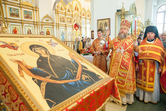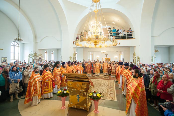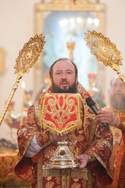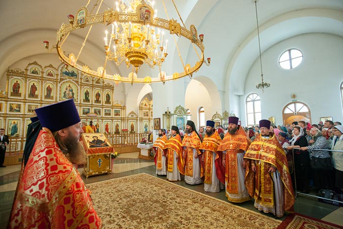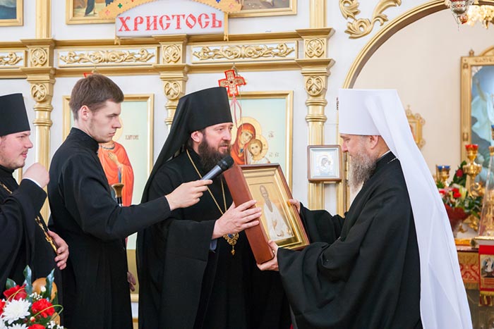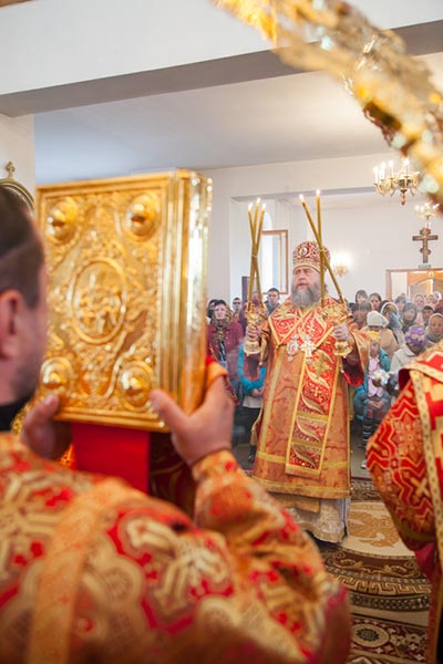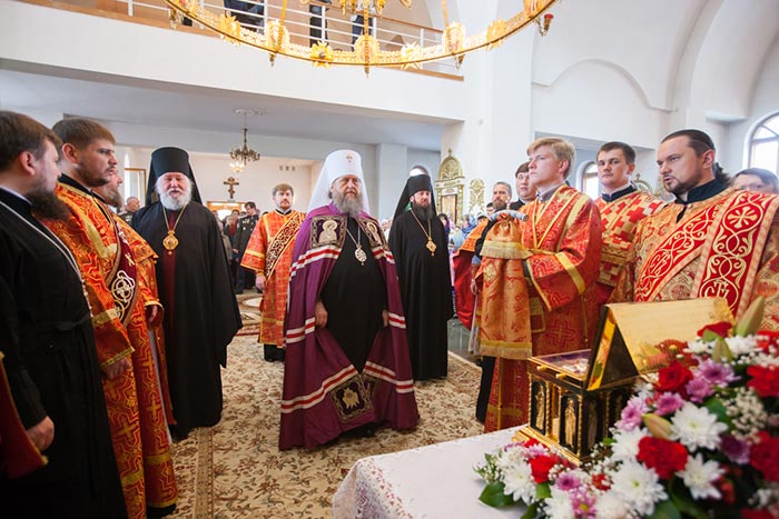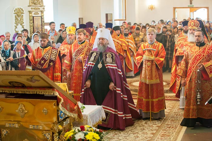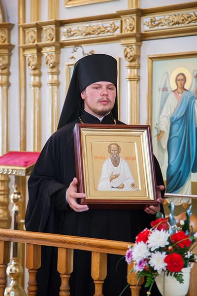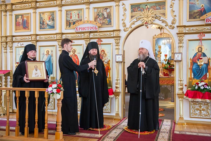 Владыка митрополит обратился к собравшимся с проповедью. Управляющий Усть-Каменогорской епархией сердечно поблагодарил Главу Митрополичьего округа за принесение на землю Восточного Казахстана великой христианской святыни. На молитвенную память о торжествах епископ Амфилохий преподнес митрополиту Александра икону святого праведного Феодора Томского, 150-летие со дня преставления которого исполняется в 2014 году.