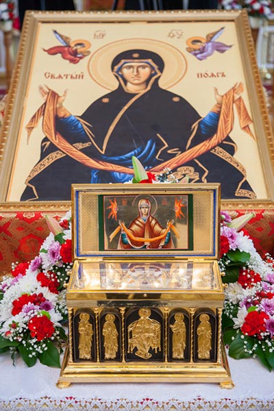 По традиции праздничное богослужение завершилось исполнением пасхальных стихир, после которого митрополит Александр перед ковчегом с Поясом Богоматери прочитал молитву и окропил верующих святой водой. Духовенство и хоровые коллективы пропели величание Богородице и святителю Николаю.