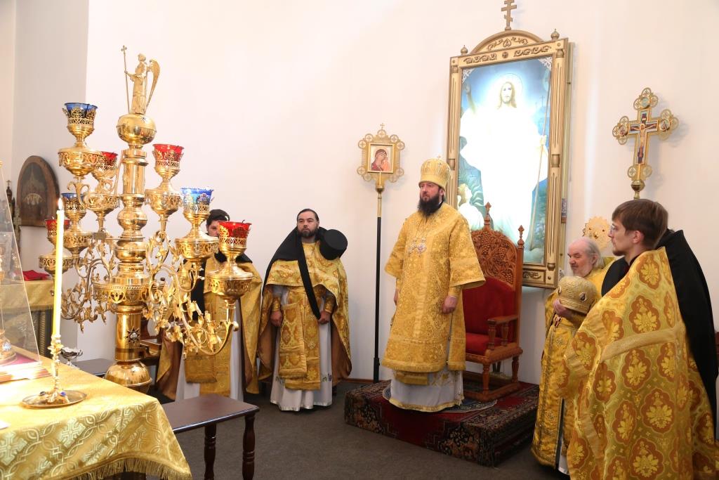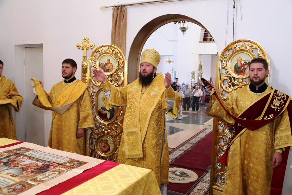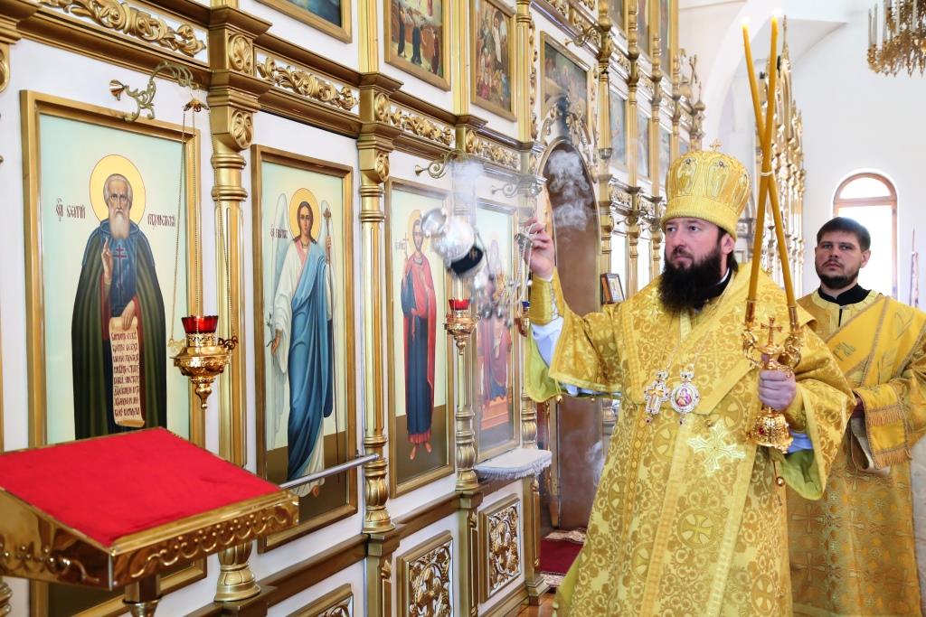 По заамвонной молитве Архипастырь с клириками воспел славление всем русским святым, после чего епископ Амфилохий обратился к народу Божию со словами проповеди.