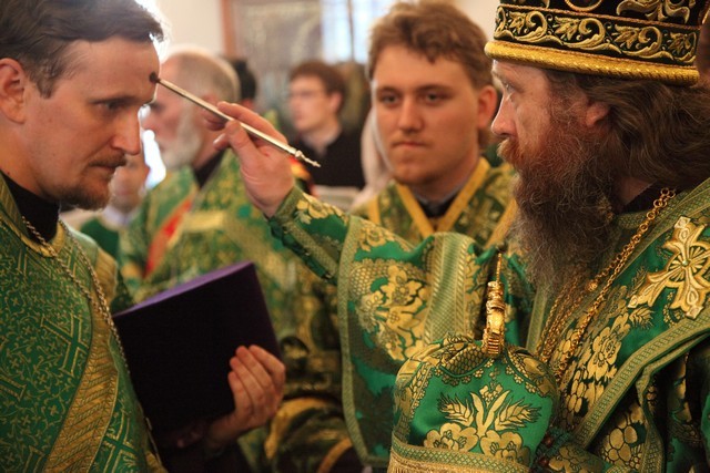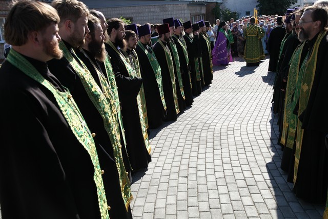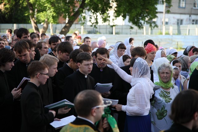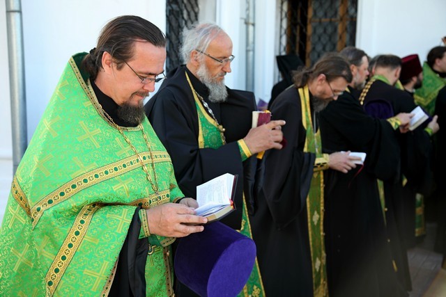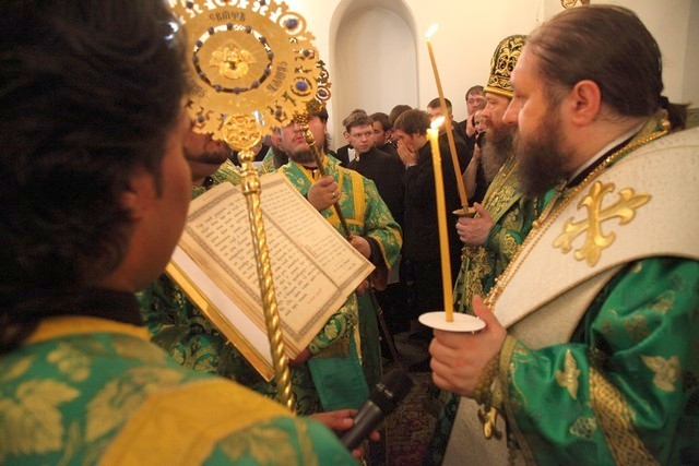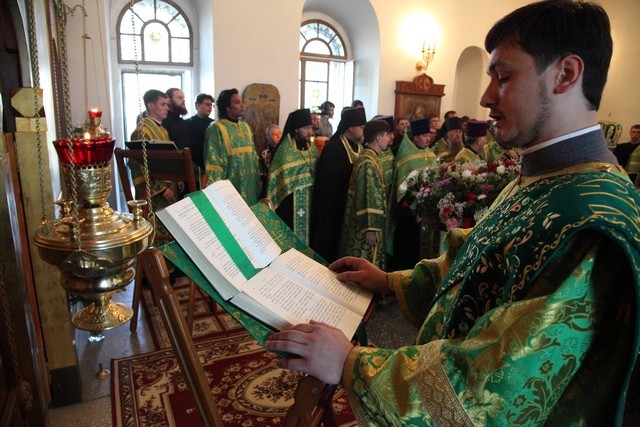 За богослужением пели хор пастырского отделения семинарии под управлением регента Марины Баёвой и хор регентской школы под управлением регента Ольги Сёминой.