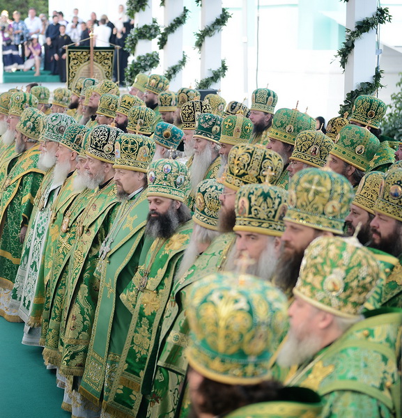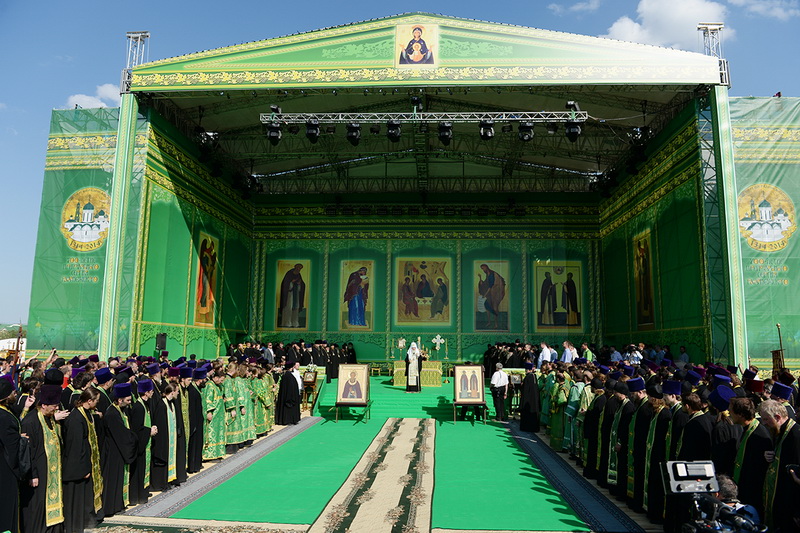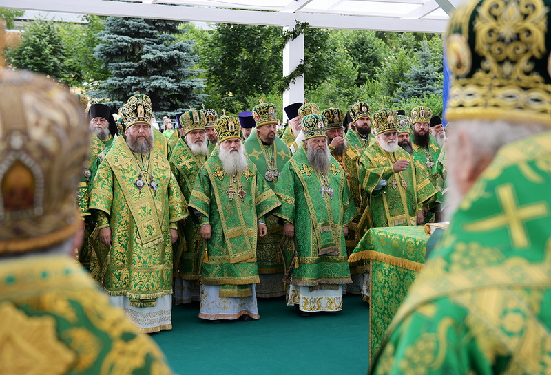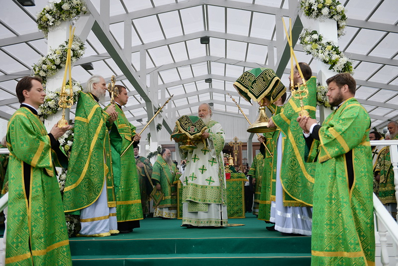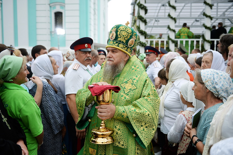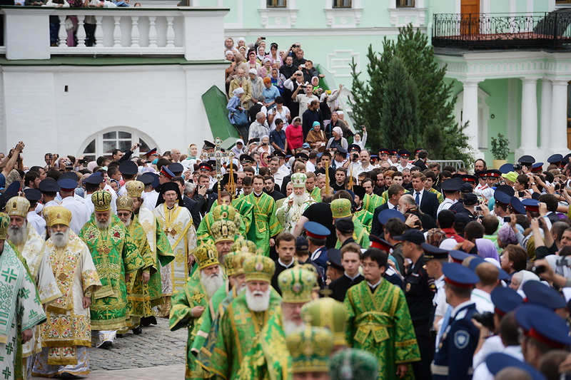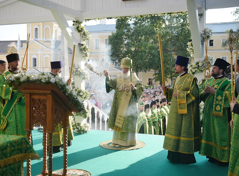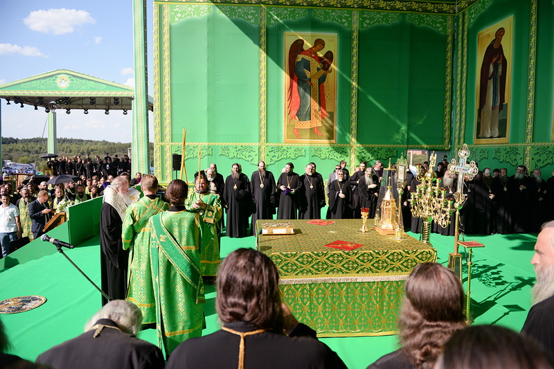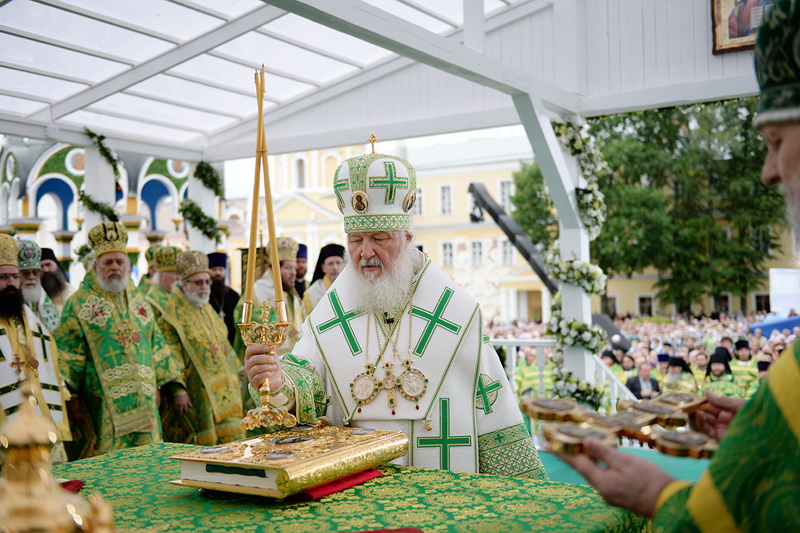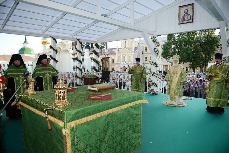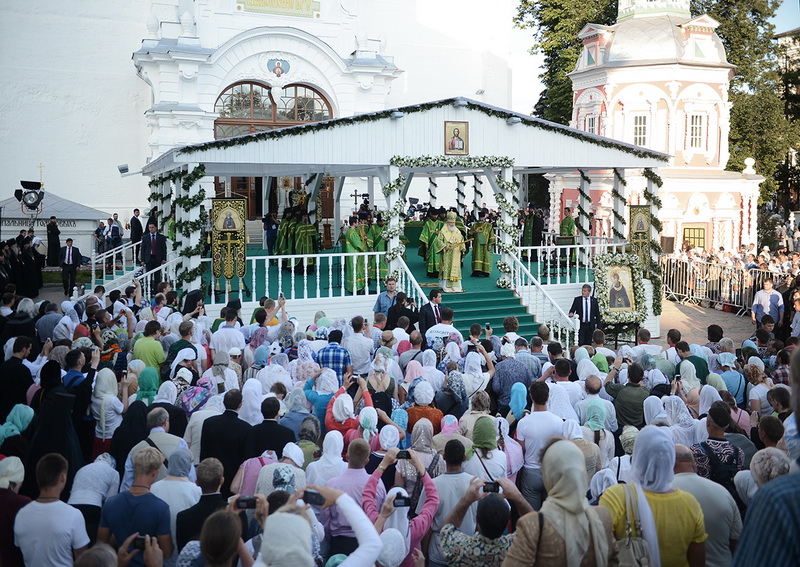 Святейший Патриарх Московский и всея Руси Кирилл возглавил служение праздничной Литургии на Соборной площади обители. Богослужение совершалось перед престолом, установленном на помосте с сенью у врат Успенского собора.