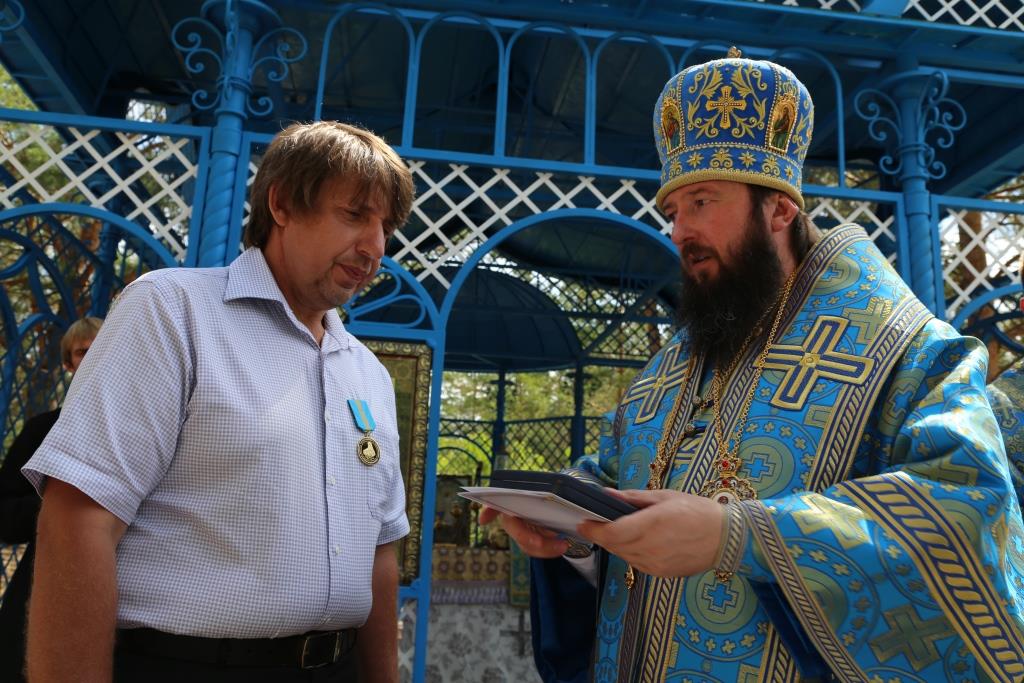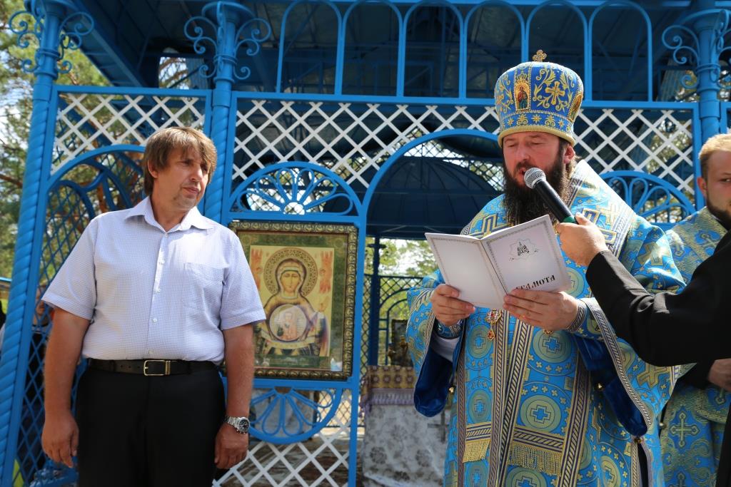 В завершение владыка епископ выразил благодарность в адрес всех, кто участвовал в строительстве и установке часовни. В частности, епископ Амфилохий поблагодарил Петухова Виктора Владимировича и наградил его медалью за помощь в сооружении часовни.