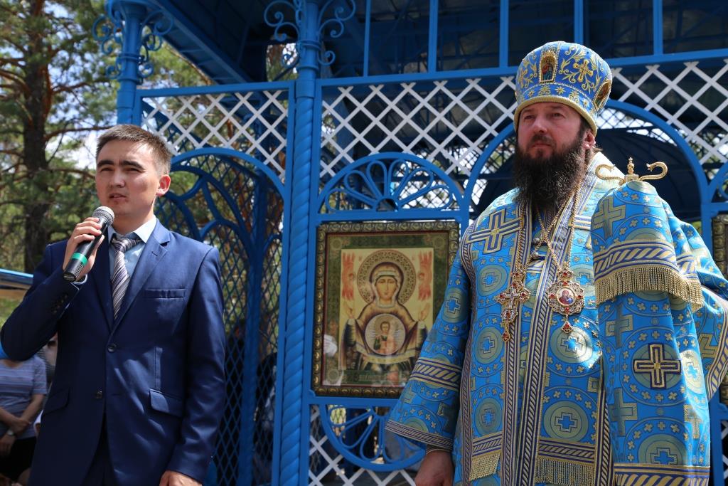 Далее владыка обратился с приветственным словом к присутствующему на богослужении заместителю руководителя отдела внутренней политики Айдару Садырбаеву. В ответной речи господин Садырбаев от имени акима города поздравил всех православных с праздником с тем, что у города есть такая святыня. Отметил, что Русская Православная Церковь оказывает большое влияние на нравственное состояние и развитие нашего общества. Совместно с государством церковь выполняет востребованную просветительскую и социальную миссию, играет важнейшую роль в поддержании межнационального и межконфессионального согласия в стране».