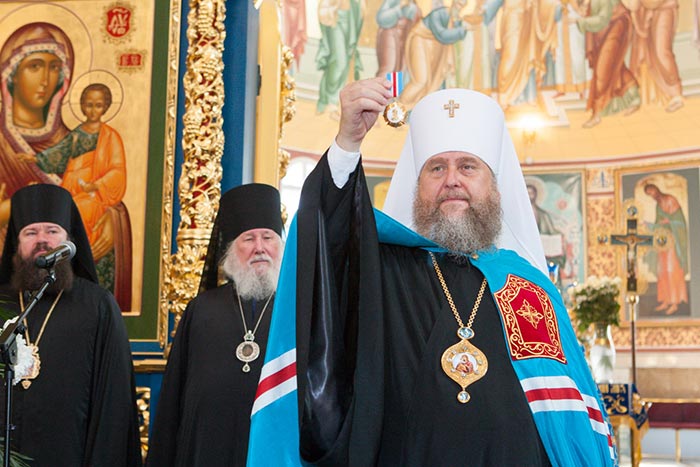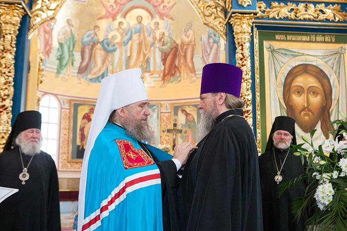За многолетние труды на благо святого Православия на Казахстанской земле митрополит Александр удостоил благочинного приходов города Петропавловска протоиерея Сергия Снопкова ордена священноисповедника Николая, митрополита Алма-Атинского.