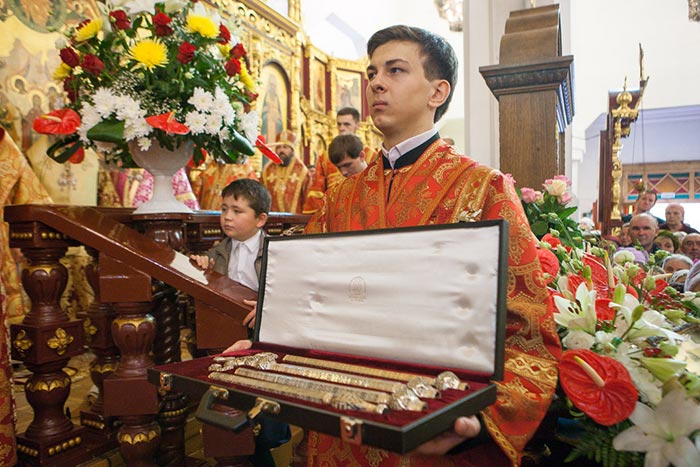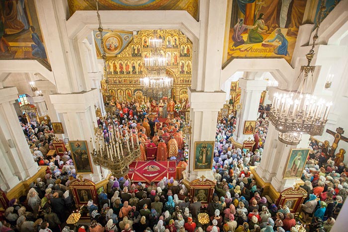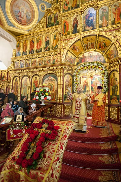 Богослужение завершилось поклонением Честному Кресту и славлением перед ковчегами с мощами мучениц Веры, Надежды, Любови и матери их Софии, и преподобного Сергия Радонежского.
