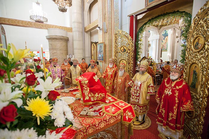К началу праздничной Божественной Литургии в Вознесенский кафедральный собор был доставлен ковчег с мощами преподобного Сергия Радонежского. Служащими архипастырями под пение тропаря «От юности восприял еси Христа в души твоей, преподобне» святыня внесена под своды храма и установлена в центре храма. К празднику в главный алма-атинский храм из Иверско-Серафимовского монастыря была доставлена еще одна святыня – ковчег с мощами мучениц Веры, Надежды, Любови и Софии.