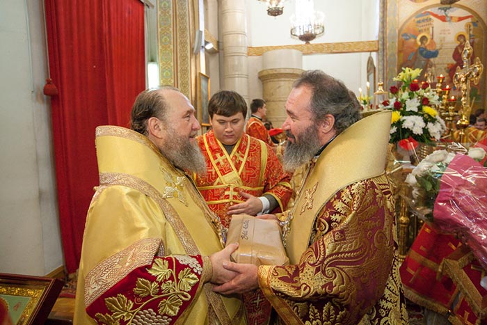 От духовенства Алма-Атинской епархии к митрополиту Александру со словами поздравления обратился протоиерей Валерий Захаров. В дар своему архипастырю алма-атинские священнослужители преподнесли архиерейский жезл.