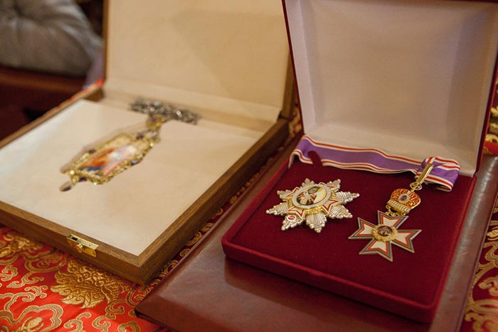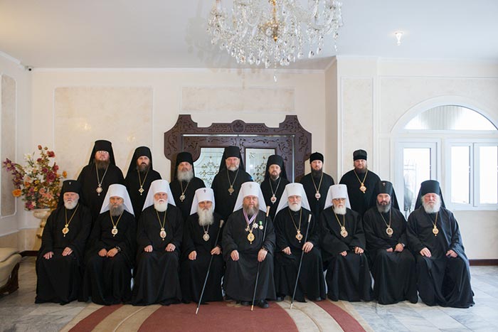 Управляющий делами Православной Церкви Казахстана епископ Каскеленский Геннадий поздравил митрополита Александра от членов Синода Казахстанского Митрополичьего округа и огласил приветственный адрес. Старейший из присутствующих казахстанских иерархов – архиепископ Чимкентский и Таразский Елевферий – за труды на Казахстанской земле вручил Главе Митрополичьего округа от имени Казахстанского Синода орден преподобноисповедника Севастиана Карагандинского.