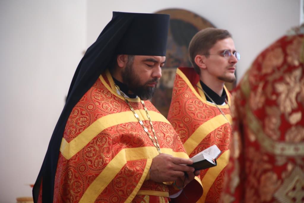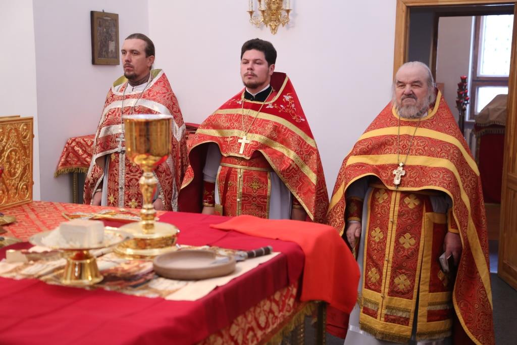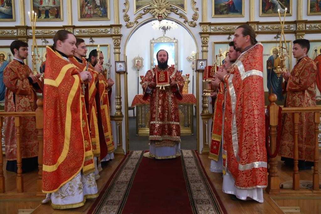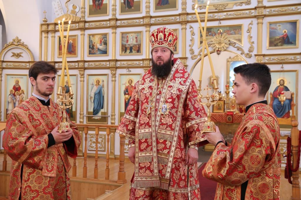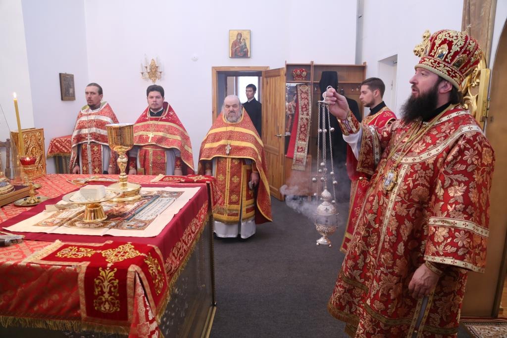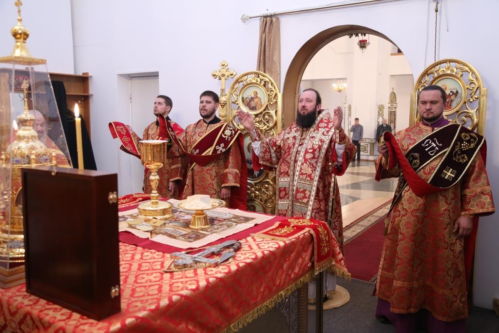 Преосвященному владыке сослужили: архимандрит Спиридон (Теплухин), иеромонах Севастиан (Андрющенко), иеромонах Силуан (Магилев), иерей Константин Дьяков, иерей Алексий Клепиков, иерей Евгений Хохряков; диаконский чин возглавил протодиакон Георгий Засыпкин.