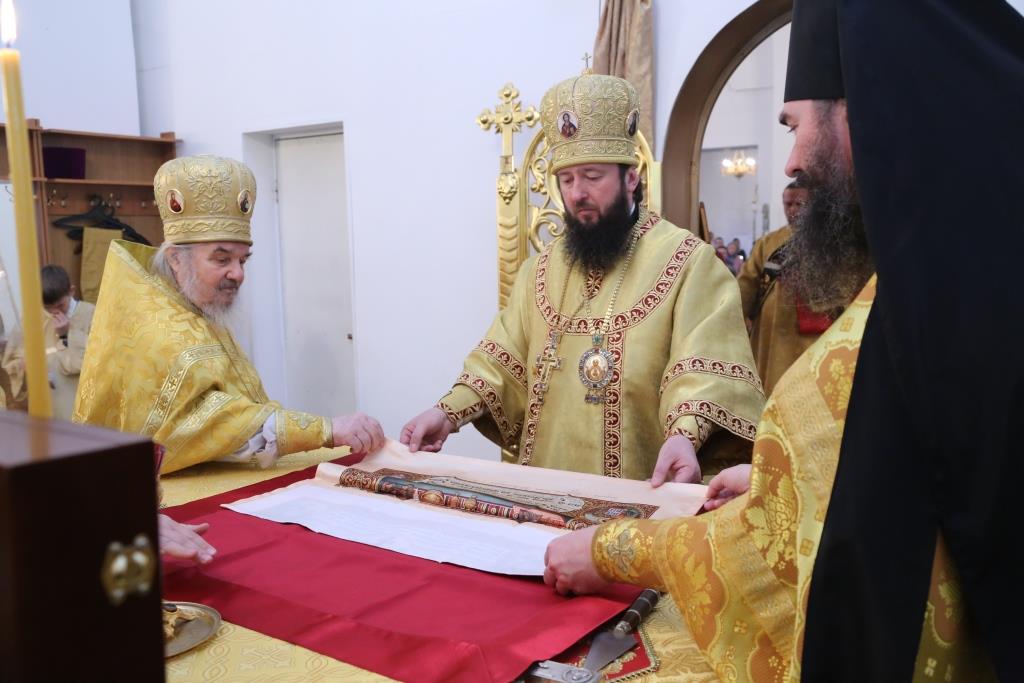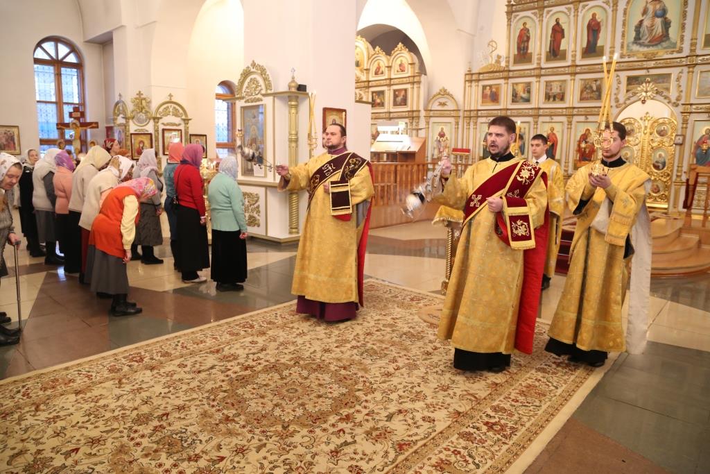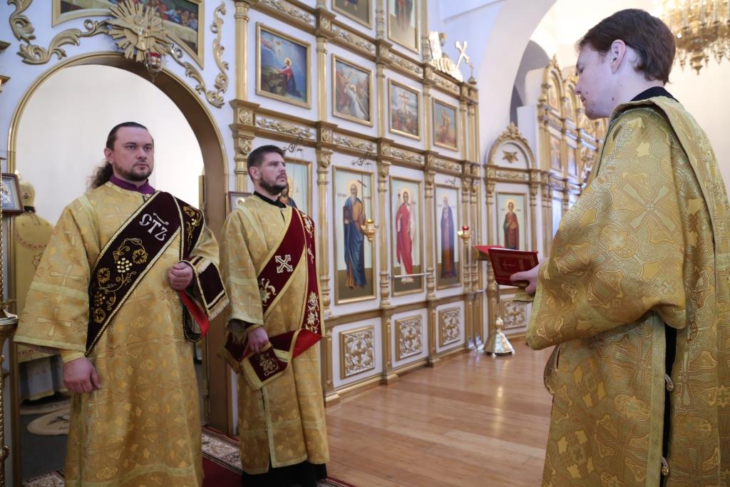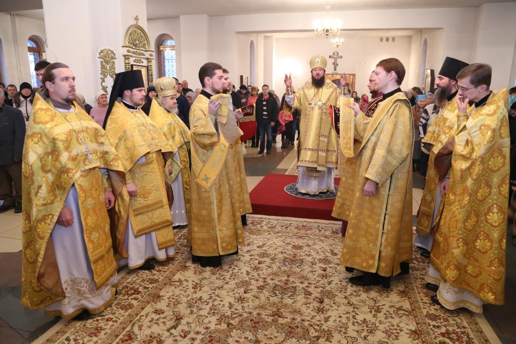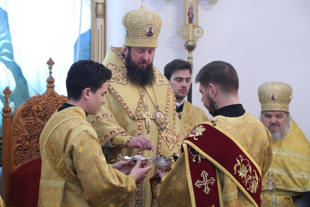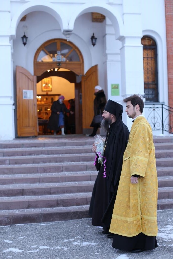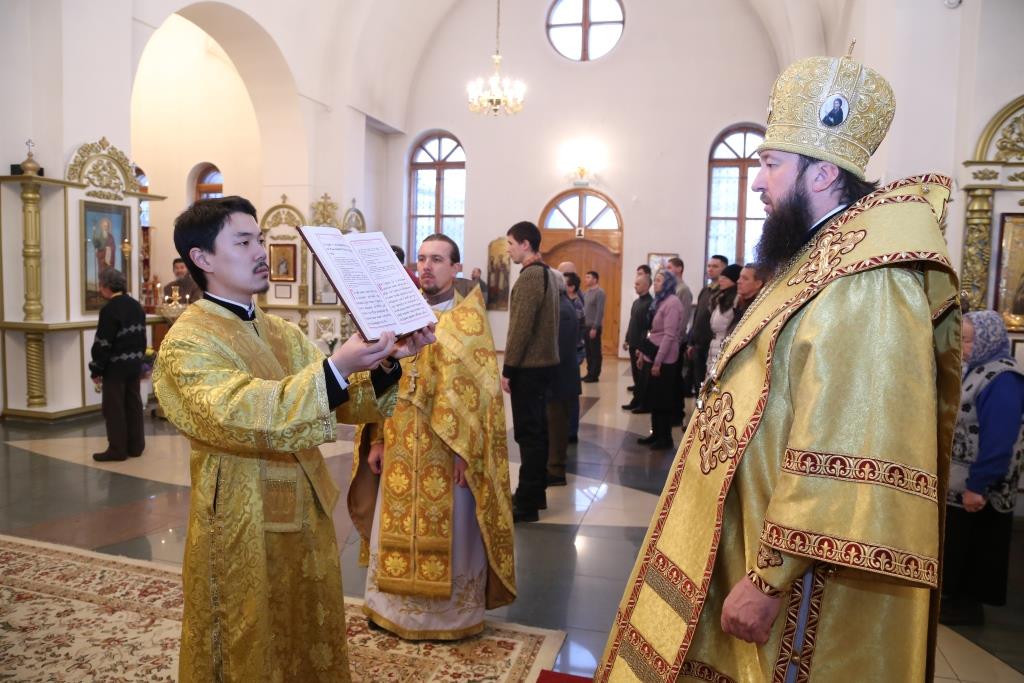 Его Преосвященству сослужили: духовник Свято-Троицкого Усть-Каменогорского мужского монастыря архимандрит Спиридон (Теплухин), ключарь Андреевского собора иеромонах Никодим (Авдеев), иеромонах Севастиан (Андрющенко), секретарь Управляющего Усть-Каменогорской епархией иеромонах Силуан (Магилев), заведующий канцелярией Усть-Каменогорского епархиального управления иерей Константин Дьяков, иерей Алексий Клепиков; протодиакон Георгий Засыпкин, протодиакон Андрей Дудник, иеродиакон Мефодий (Шевчук), диакон Георгий Сухобокий.