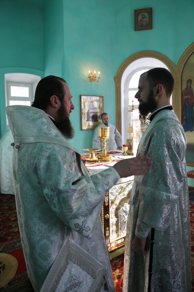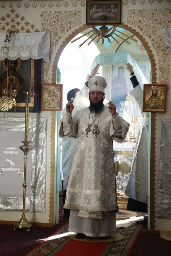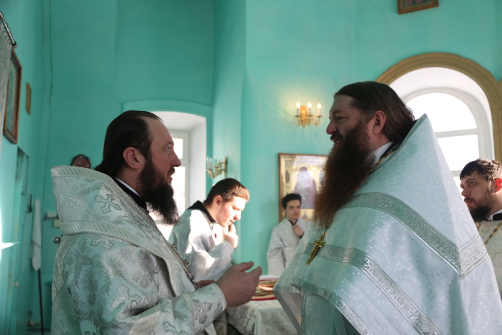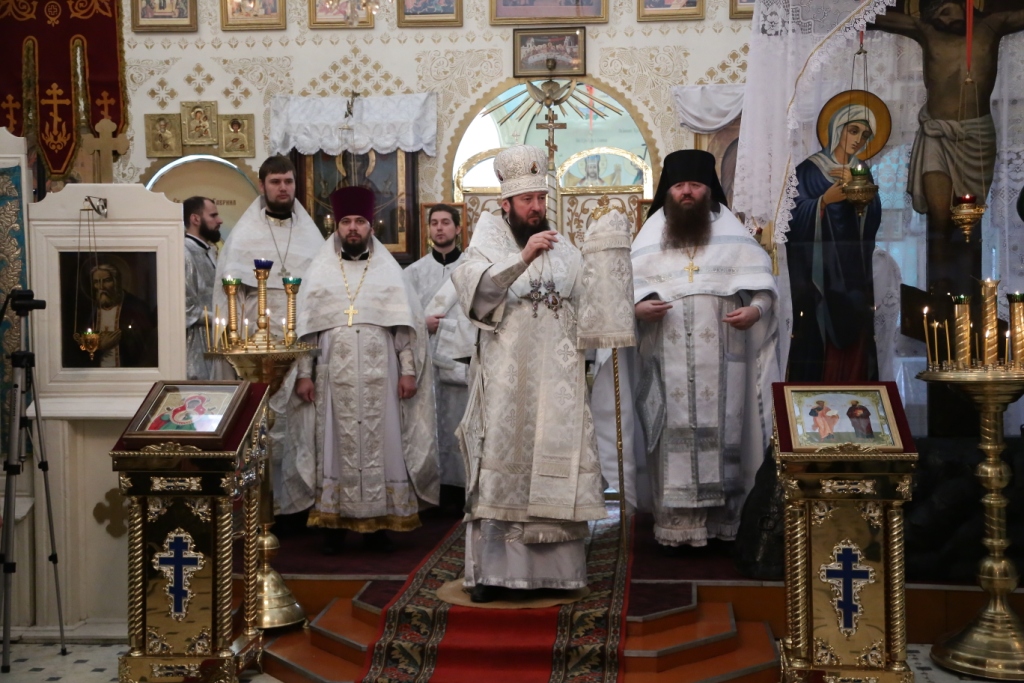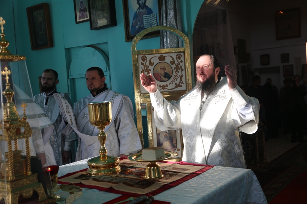 Его Преосвященству сослужили: духовник монастыря игумен Аникита (Макаров), председатель Епархиальной комиссии по делам молодёжи иерей Вячеслав Гутов, секретарь Управляющего Усть-Каменогорской епархией иеромонах Силуан (Магилев), клирик Воскресенского кафедрального собора г. Семипалатинска иерей Евгений Потылицын; протодиакон Андрей Дудник, иеродиакон Мефодий (Шевчук).