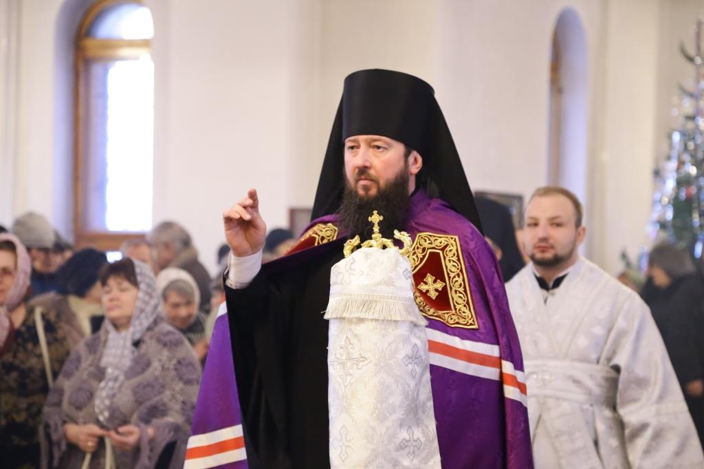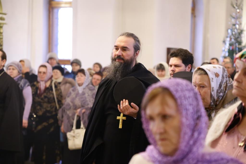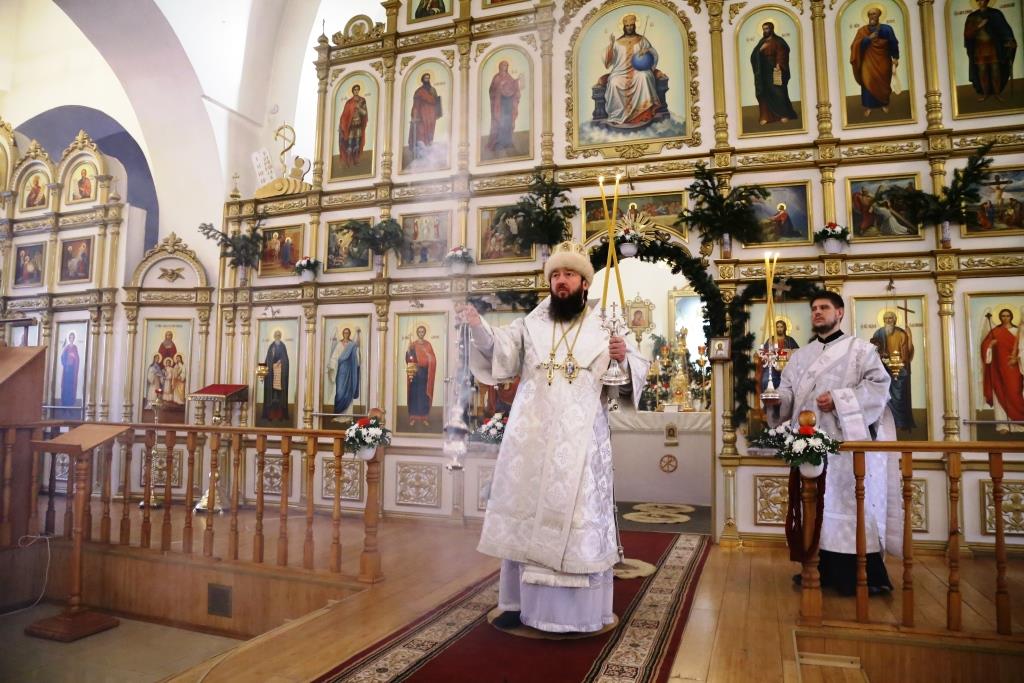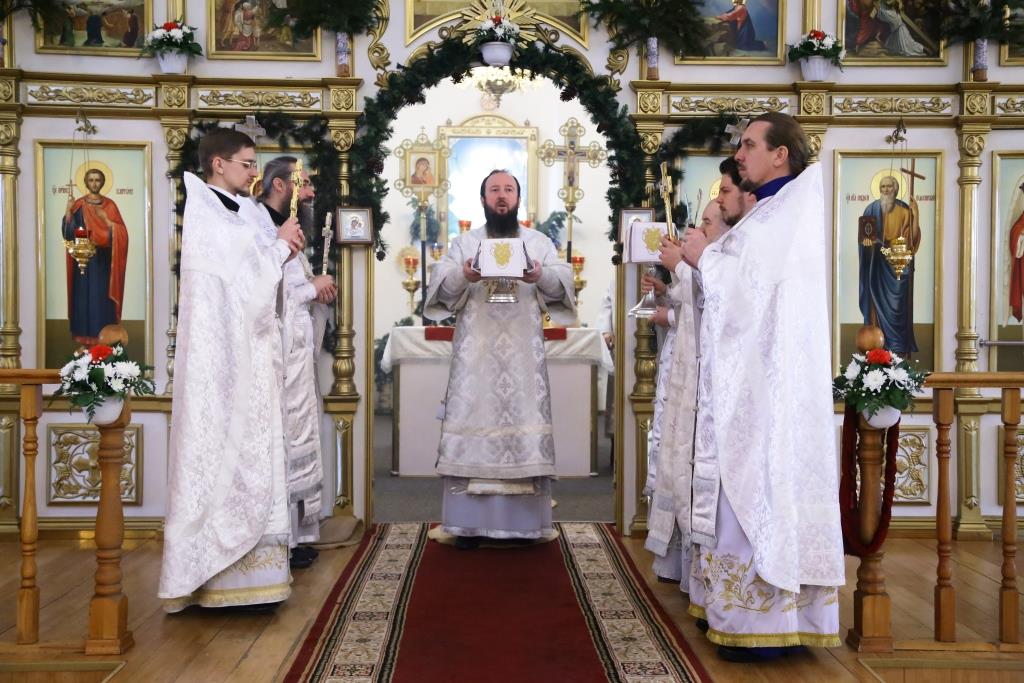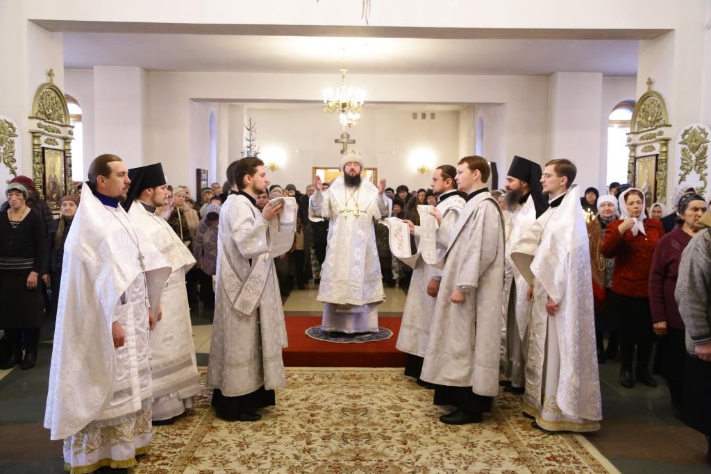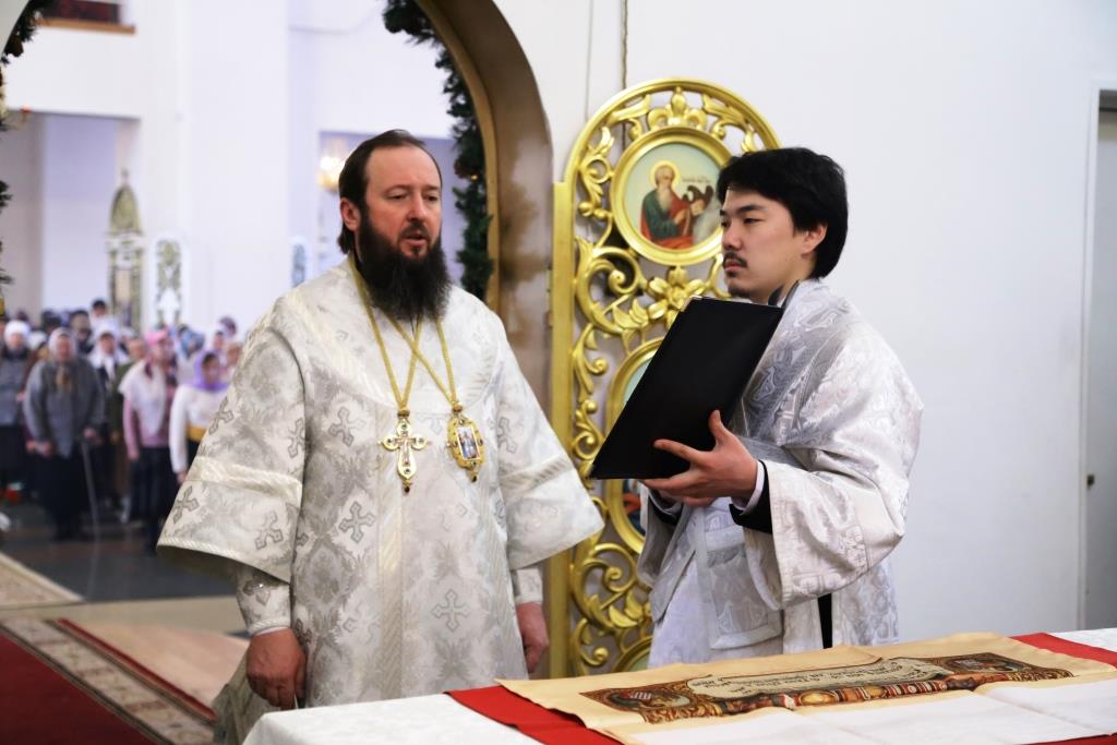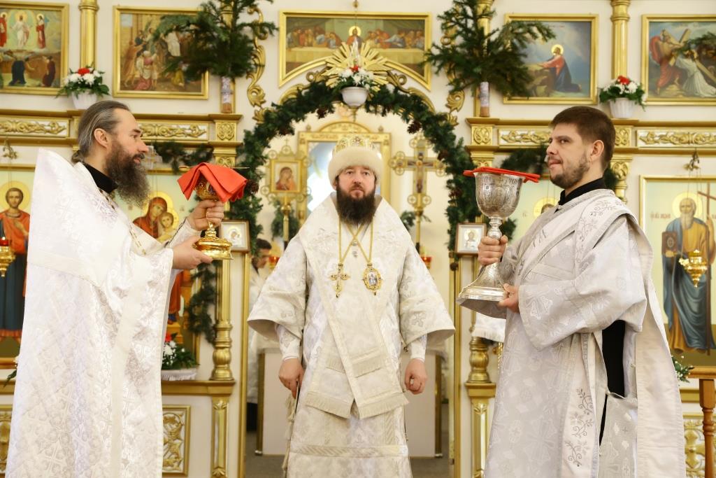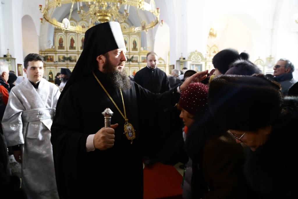 Его Преосвященству сослужили: духовник Свято-Троицкого Усть-Каменогорского мужского монастыря архимандрит Спиридон (Теплухин), ключарь Андреевского собора иеромонах Никодим (Авдеев), секретарь Управляющего Усть-Каменогорской епархией иеромонах Силуан (Магилев), заведующий канцелярией Усть-Каменогорского епархиального управления иерей Константин Дьяков, клирик собора иерей Алексий Клепиков; диаконский чин возглавил протодиакон Георгий Засыпкин.
