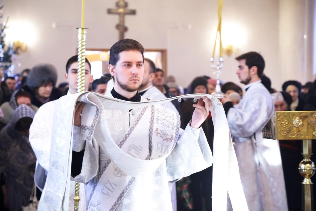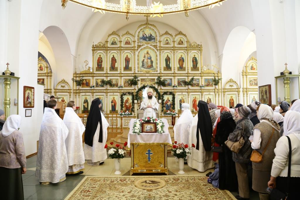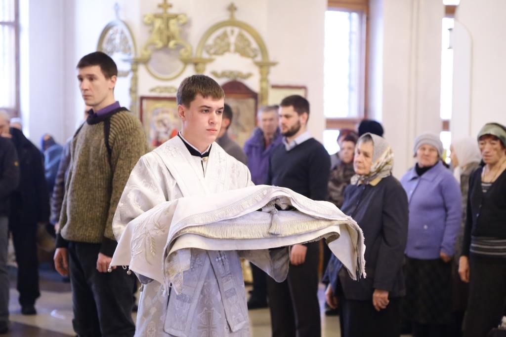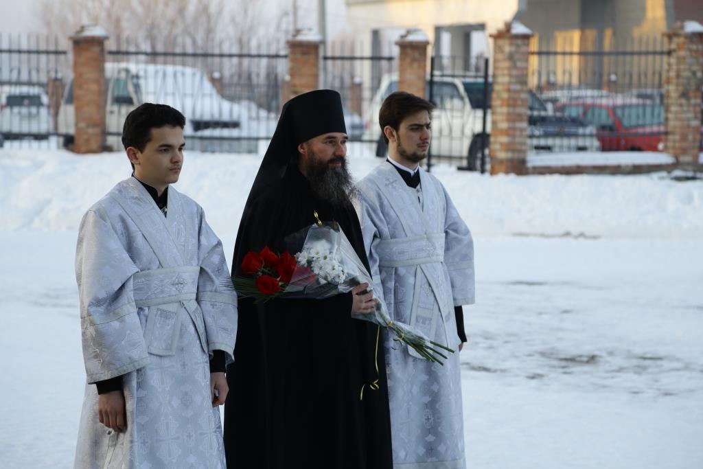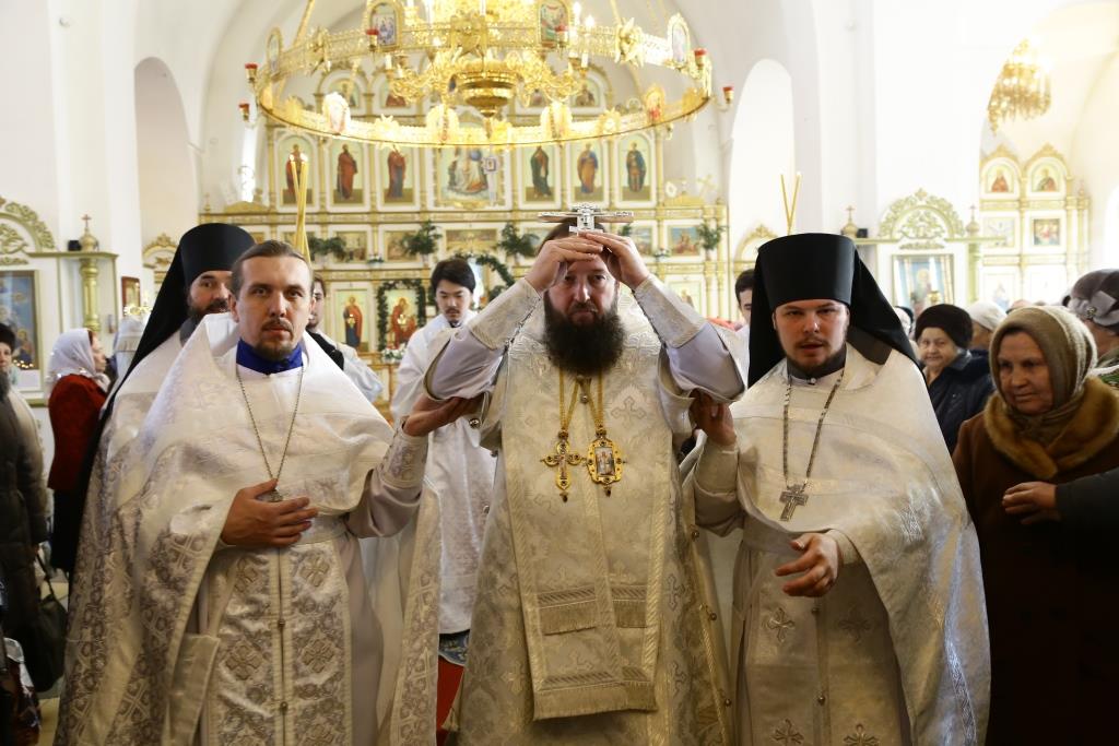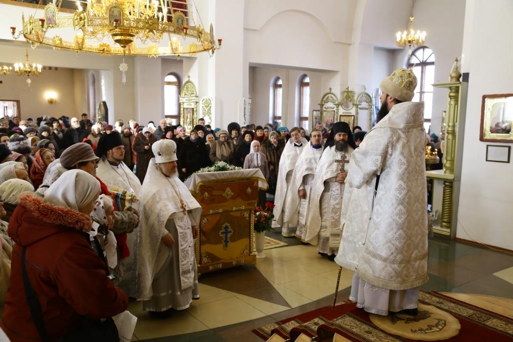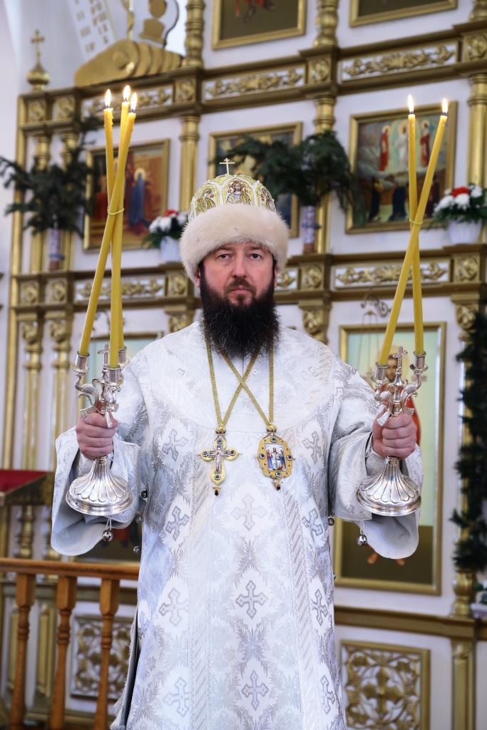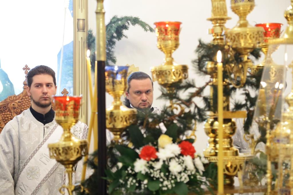 Его Преосвященству сослужили: духовник Свято-Троицкого Усть-Каменогорского мужского монастыря архимандрит Спиридон (Теплухин), ключарь Андреевского собора иеромонах Никодим (Авдеев), секретарь Управляющего Усть-Каменогорской епархией иеромонах Силуан (Магилев), заведующий канцелярией Усть-Каменогорского епархиального управления иерей Константин Дьяков, клирик собора иерей Алексий Клепиков; диаконский чин возглавил протодиакон Георгий Засыпкин.