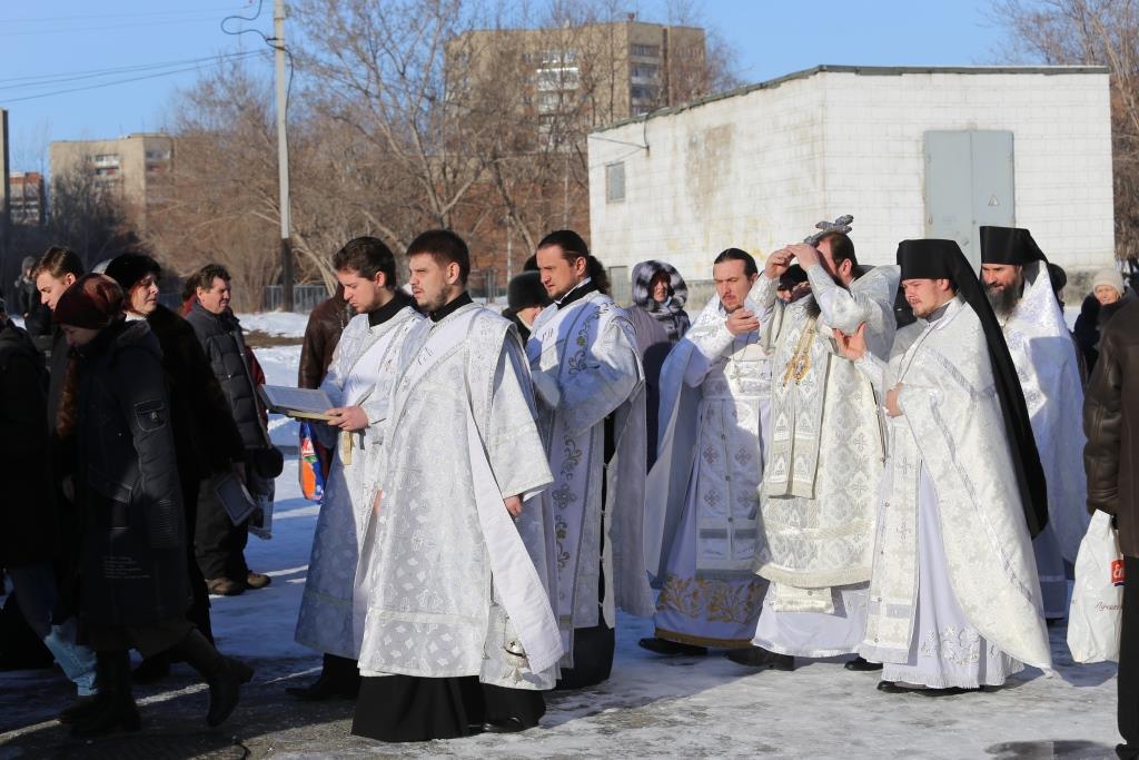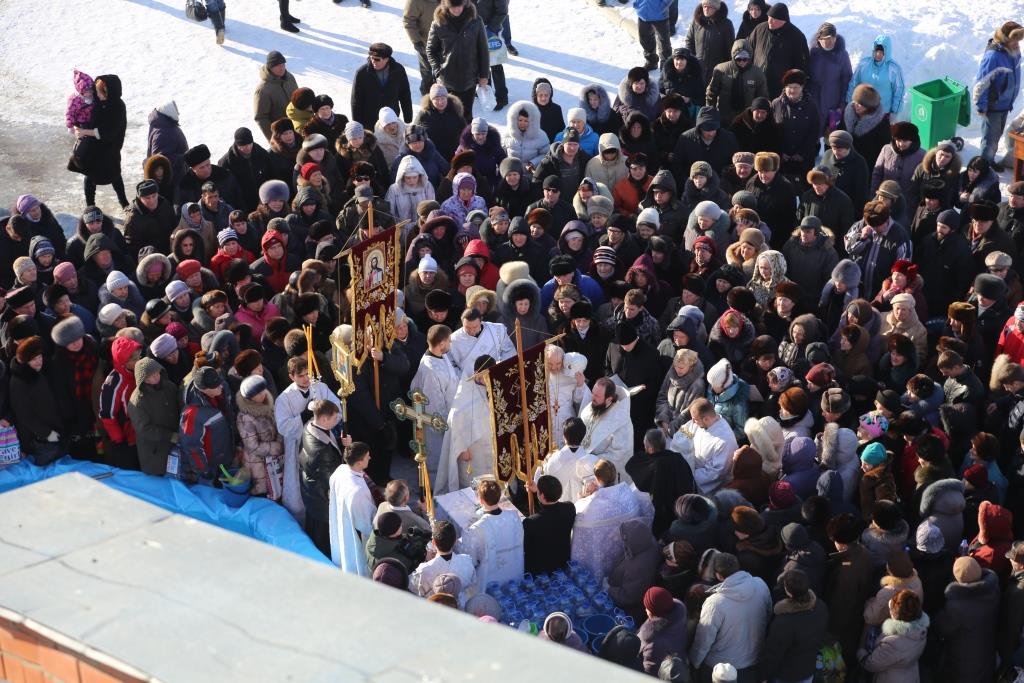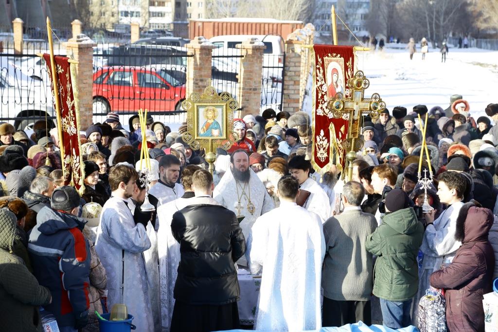 По заамвонной молитве при пении тропарей «Глас Господень на водах» священнослужители вышли из храма, где в специально устроенной купели было совершено великое освящение воды.