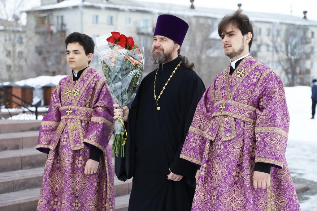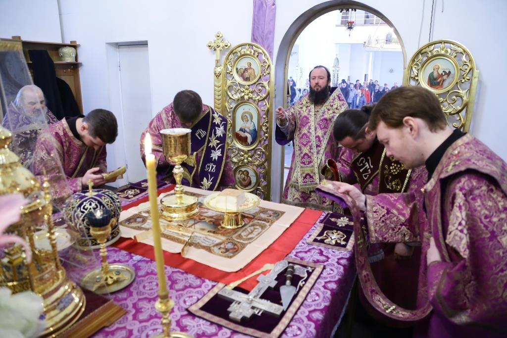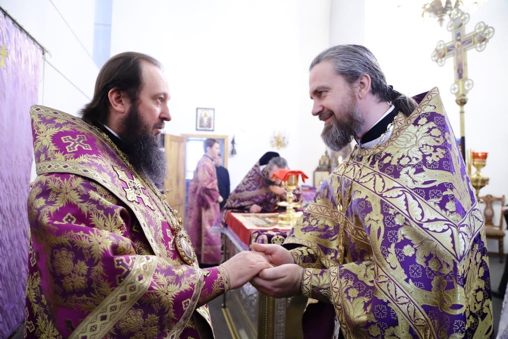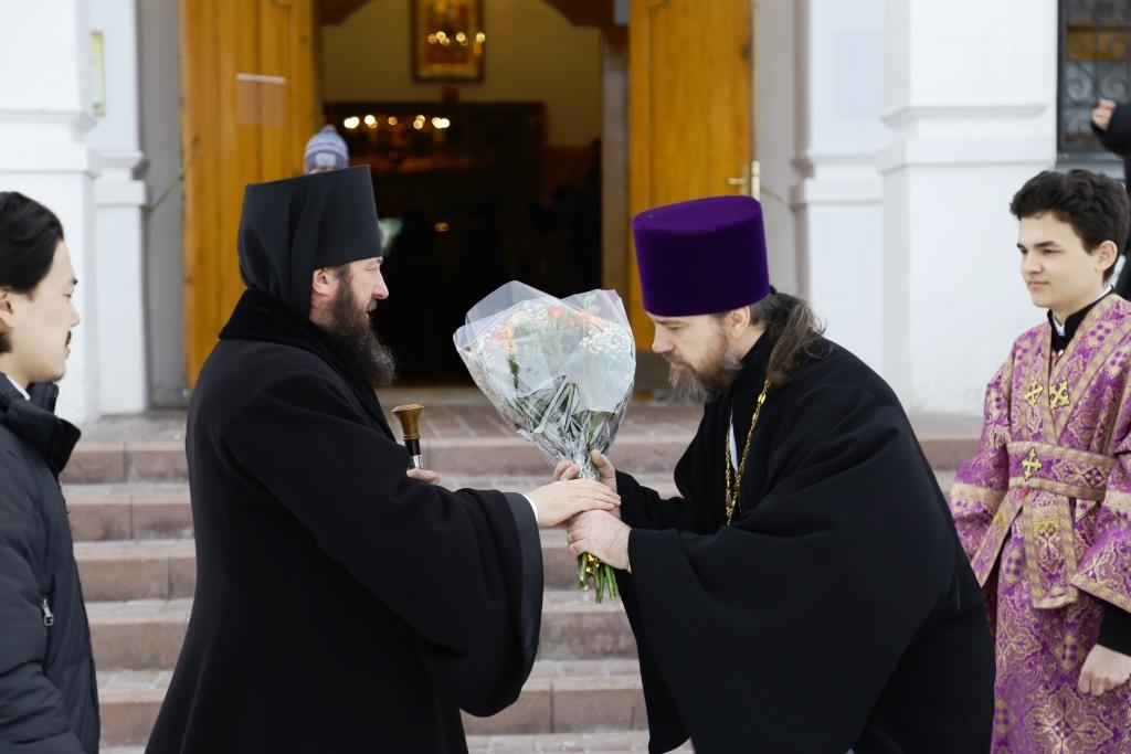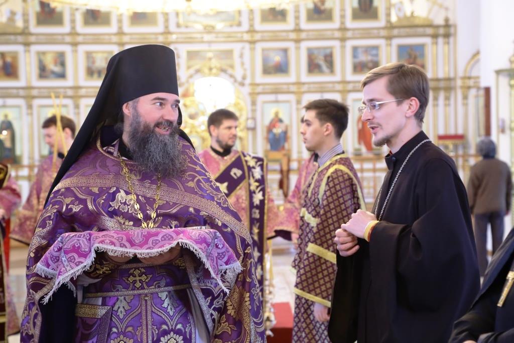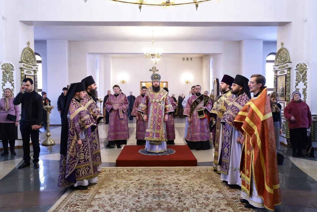 Его Преосвященству сослужили: духовник Усть-Каменогорской епархии архимандрит Спиридон (Теплухин), благочинный Усть-Каменогорского церковного округа, настоятель Покровского храма иерей Алексий Анищенко; ключарь Андреевского собора иеромонах Никодим (Авдеев), клирик собора иеромонах Севастиан (Андрющенко), секретарь Управляющего Усть-Каменогорской епархией иеромонах Силуан (Магилёв), заведующий Епархиальной канцелярией иерей Константин Дьяков; протодиакон Георгий Засыпкин, протодиакон Андрей Дудник, иеродиакон Мефодий (Шевчук), диакон Георгий Сухобокий.