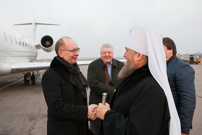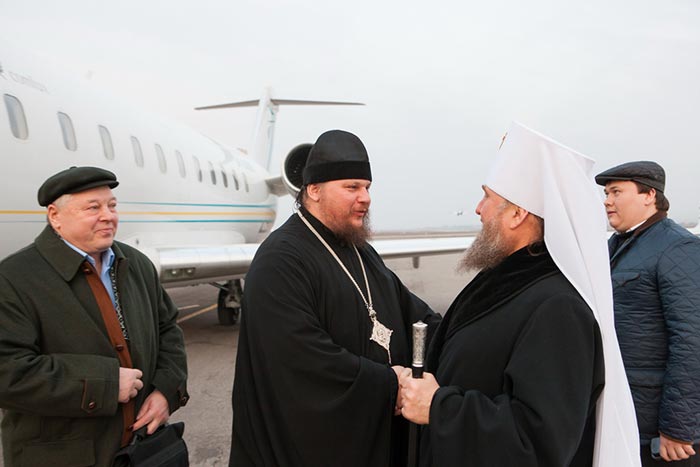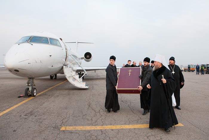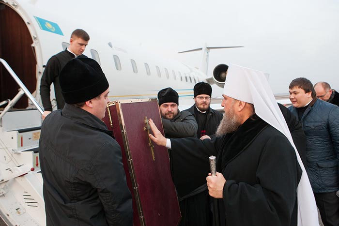 В международном аэропорту Алма-Аты Феодоровскую икону Царицы Небесной встречали: Глава Митрополичьего округа Русской Православной Церкви в Республике Казахстан митрополит Астанайский и Казахстанский Александр, благочинный алма-атинских приходов протоиерей Валерий Захаров, игумен Феодосий (Белобородов), руководитель информационного отдела Митрополичьего округа протоиерей Евгений Иванов, руководитель службы протокола Митрополита протодиакон Роман Головин, священнослужители Южной столицы; секретарь Митрополичьего округа, Заслуженный деятель искусств России О.Н. Овчинников; консул Генерального Консульства Российской Федерации в Алма-Ате И.В. Переверзева.