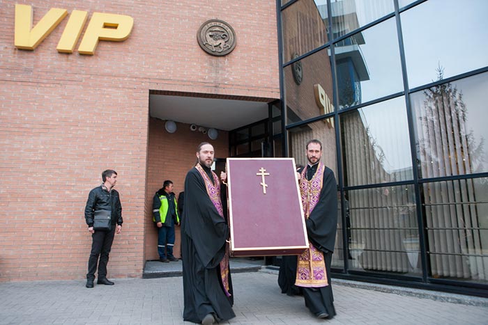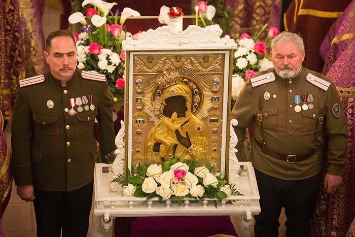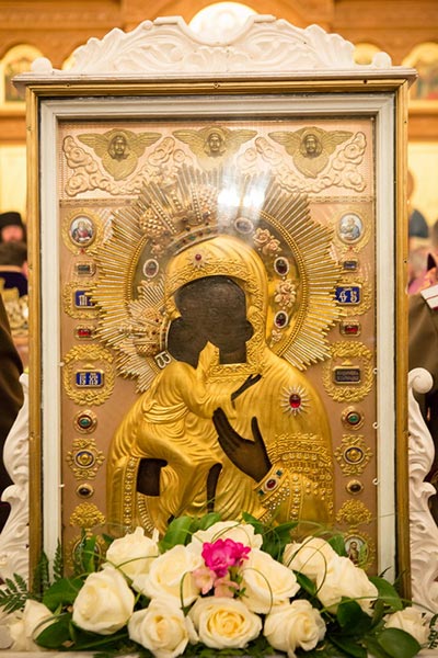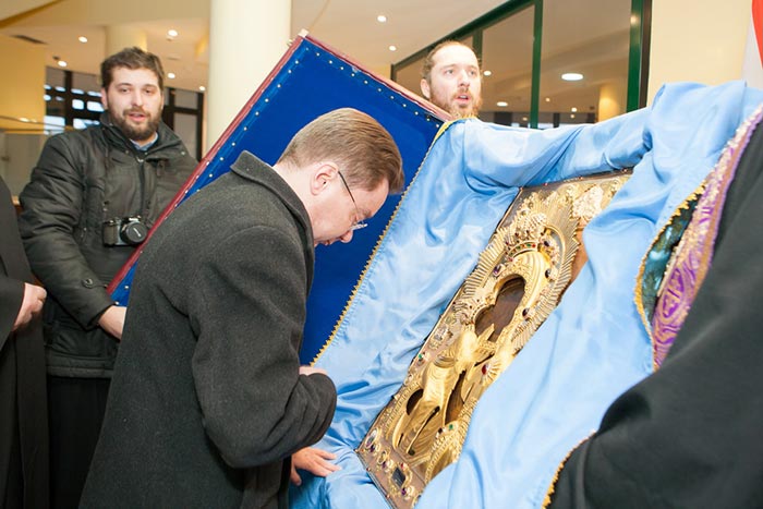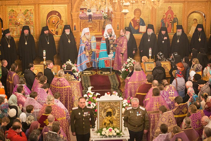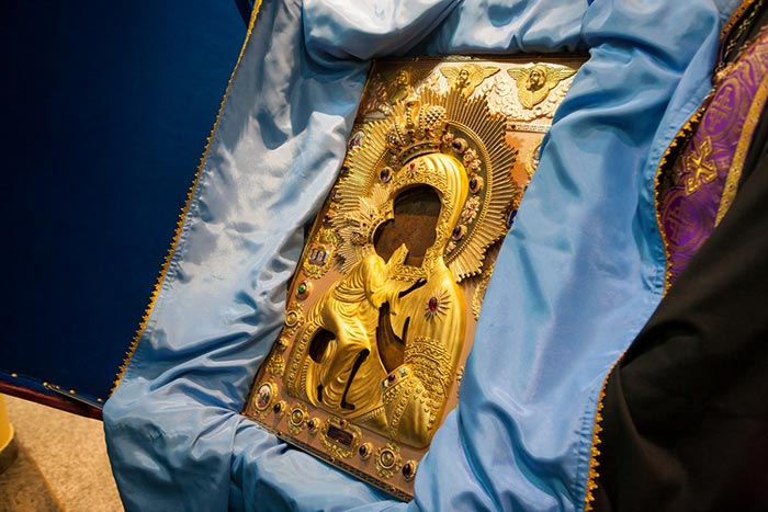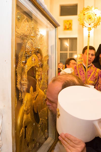 Под пение тропаря «Пришествием честныя Твоея иконы, Богоотроковице» иерархи внесли чудотворный образ под своды собора и установили киот в центре храма, после чего началось совершение молебна.