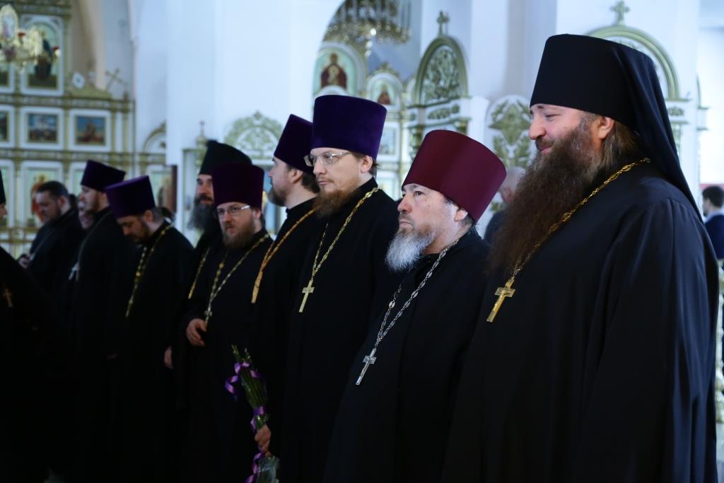 За Божественной литургией владыке Амфилохию сослужили: духовник Усть-Каменогорской епархии архимандрит Спиридон (Теплухин), благочинный Усть-Каменогорского церковного округа иерей Алексий Анищенко, настоятели храмов епархии, духовенство Восточно-Казахстанской области.