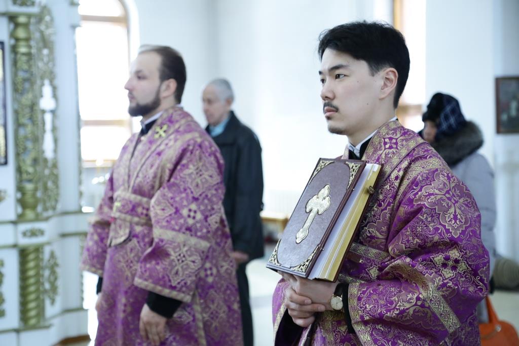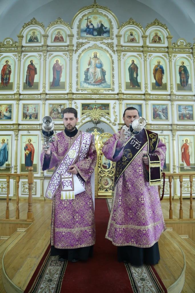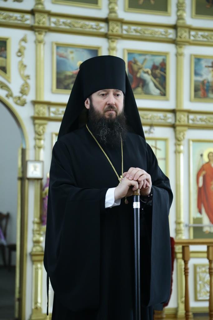 Его Преосвященству сослужили: духовник епархии архимандрит Спиридон (Теплухин), ключарь кафедрального собора иеромонах Никодим (Авдеев), иеромонах Севастиан (Андрющенко), личный секретарь Владыки иеромонах Силуан (Магилев), заведующий канцелярией епархиального управления иерей Константин Дьяков, настоятель Успенского храма села Канонерка иерей Георгий Гуцалов. Диаконский чин возглавил протодиакон Георгий Засыпкин.