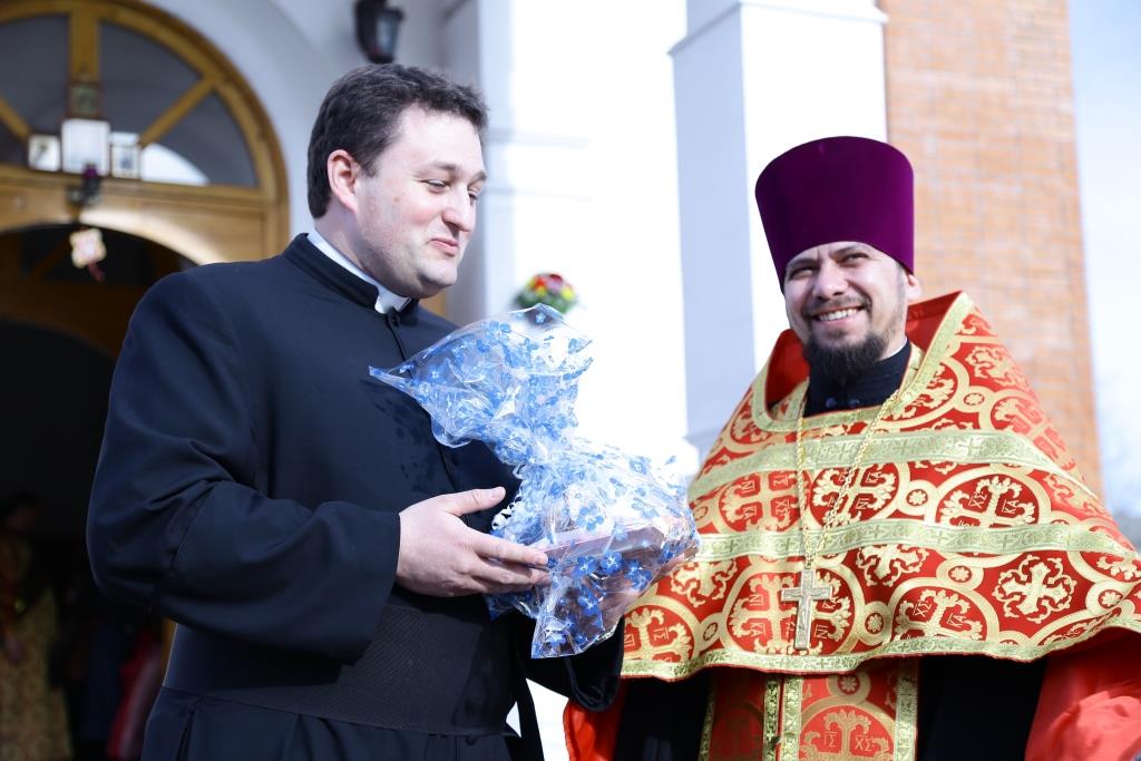 Отец Алексий преподнес Его Преосвященству пасхальное яйцо и букет цветов.