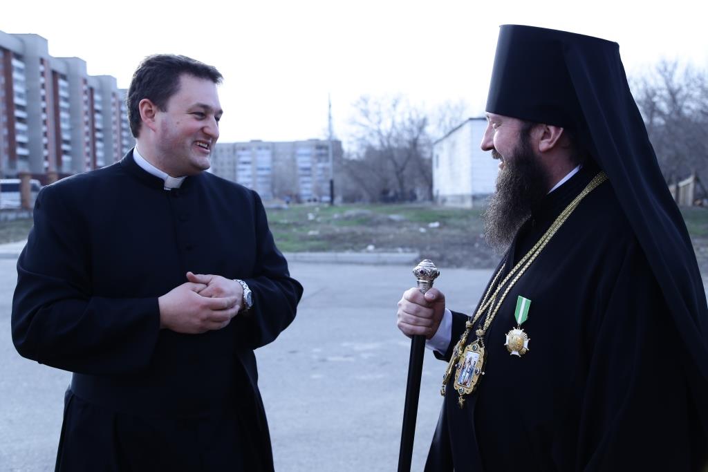 Перед началом богослужения с праздником Святой Пасхи Преосвященного Амфилохия и верующих Восточно-Казахстанской области поздравил настоятель римско-католического прихода Пресвятой Девы Марии Святого Розария г.Усть-Каменогорска священник Франческо Де Пьюдт, который преподнёс в дар владыке Амфилохию пасхального агнца — образ жертвенного служения Господа нашего Иисуса Христа.