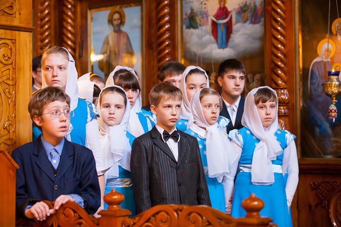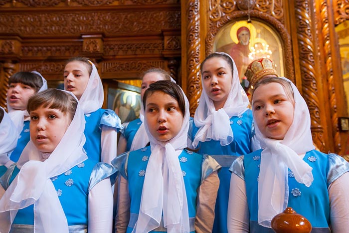 С Пасхой Христовой и днем небесного покровителя Карагандинской земли участников богослужения стихами и песнями приветствовали воспитанники детской воскресной школы при Введенском соборе.