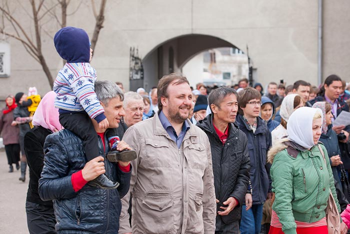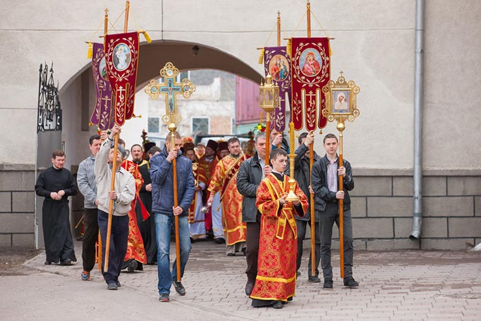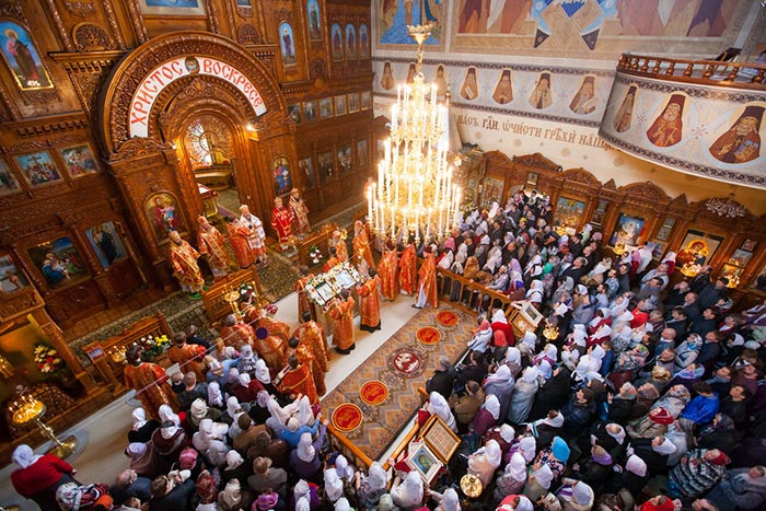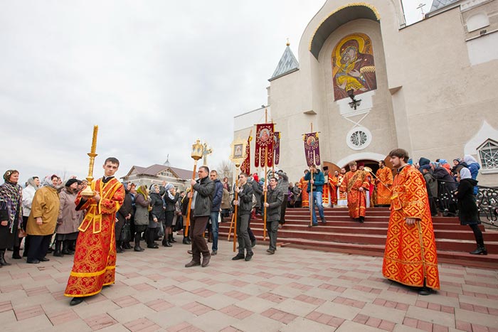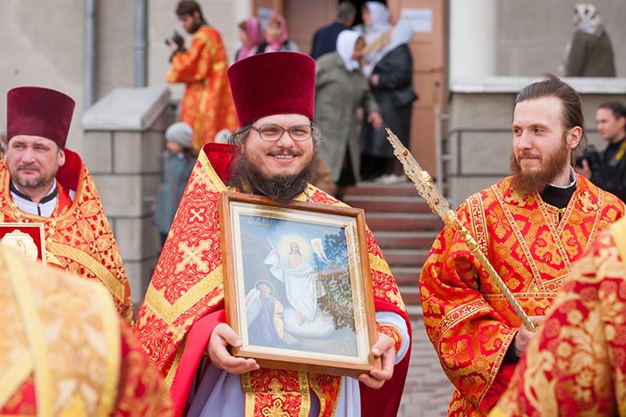 В завершение богослужения состоялось славление – духовенство и хор исполнили стихиры Пасхи, перед ракой с мощами преподобноисповедника Севастиана была прочитана молитва и пропето величание, после чего иерархи, священнослужители и верующие крестным ходом обошли вокруг собора. На паперти храма владыка митрополит похристосовался со священнослужителями, прихожанами и паломниками и окропил собравшихся святой водой.