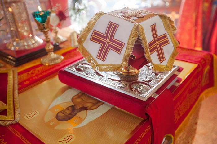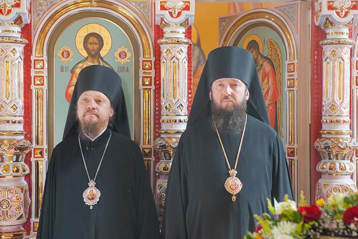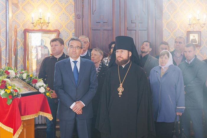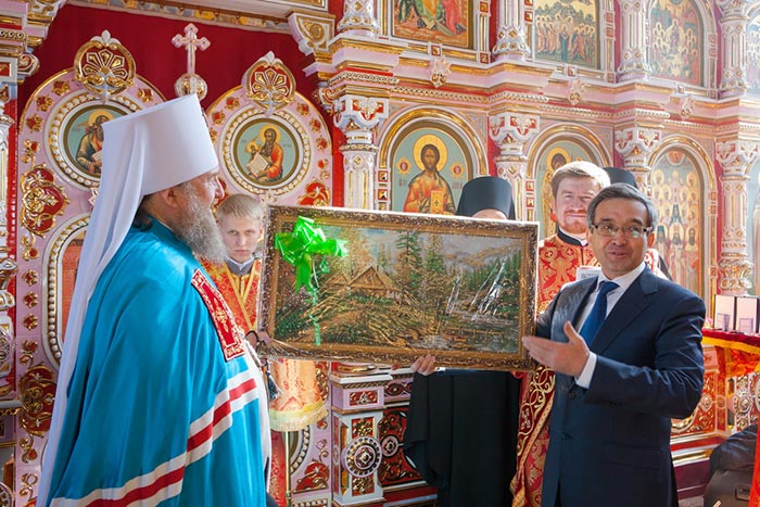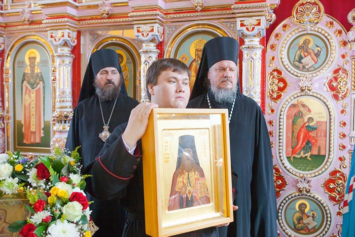 В дар новоосвященному храму Глава Митрополичьего округа передал писанную икону священномученика Мефодия, епископа Петропавловского.