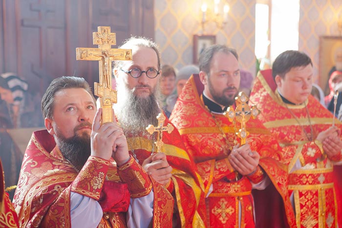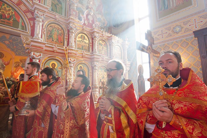 За богослужением Великого освящения и Божественной Литургией Главе Митрополичьего округа Русской Православной Церкви в Республике Казахстан сослужили: Управляющий делами Православной Церкви Казахстана епископ Каскеленский Геннадий, епископ Карагандинский и Шахтинский Севастиан, епископ Усть-Каменогорский и Семипалатинский Амфилохий, епископ Кокшетауский и Акмолинский Серапион; благочинный храмов Астаны архимандрит Сергий (Карамышев), настоятель алма-атинского храма в честь иконы Божией Матери «Всех скорбящих Радость» протоиерей Евгений Воробьев, руководитель информационного отдела Митрополичьего округа протоиерей Евгений Иванов, духовник астанайского женского монастыря в честь иконы Божией Матери «Взыскание погибших» иеромонах Модест (Дроздов), секретарь Карагандинской епархии протоиерей Владимир Фрейганг, ключарь Успенского кафедрального собора Астаны протоиерей Димитрий Байдек, ключарь храма Акмолинских новомучеников иерей Максим Маджитов, руководитель протокола митрополита протодиакон Роман Головин, клирики алма-атинского Вознесенского кафедрального собора - протодиакон Николай Гринкевич, диакон Владимир Сыровацкий и диакон Димитрий Савченко; духовенство храмов Астаны.