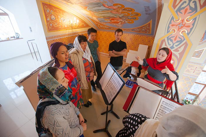 Песнопения чина освящения и Литургии исполнял хор Успенского кафедрального собора Астаны под управлением Ольги Варенцовой.