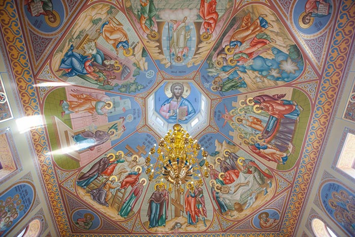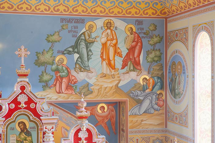 Над украшением церковных стен и сводов фресками в течение трех месяцев трудилась артель мастеров-изографов из города Палех (Россия, Ивановская область) под руководством талантливого иконописца - члена Союза художников России В.К. Курилова. Ранее эти же мастера-иконописцы расписывали Успенский кафедральный собор Астаны и Свято-Никольскую церковь в селе Малотимофеевка Целиноградского района Акмолинской области. Сюжеты росписи посвящены евангельским событиям и подвигу новомучеников ХХ столетия.