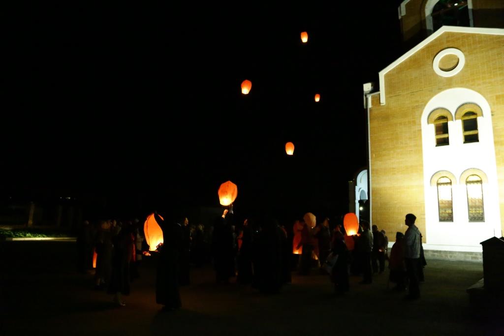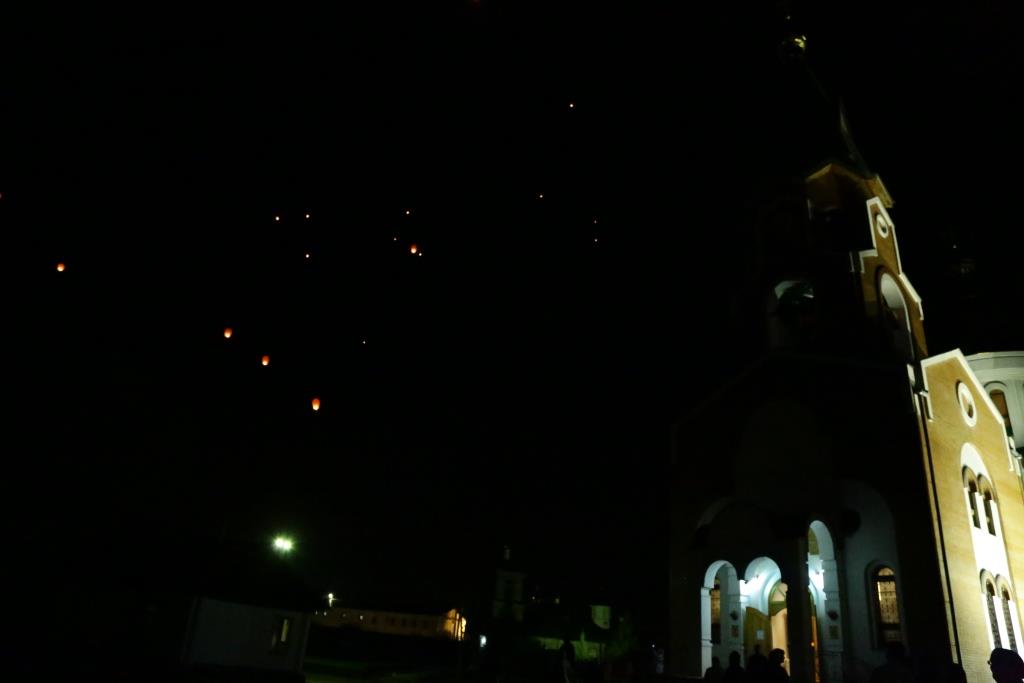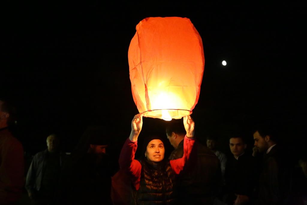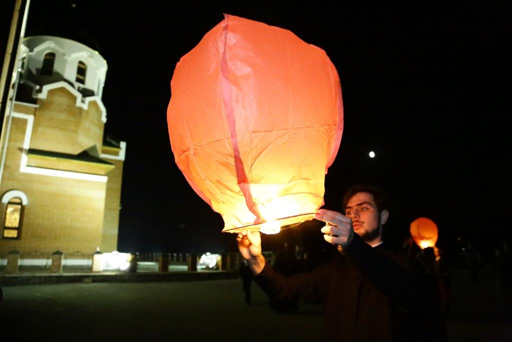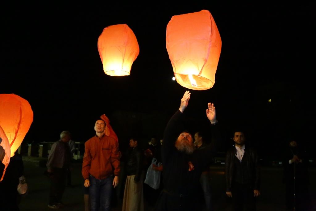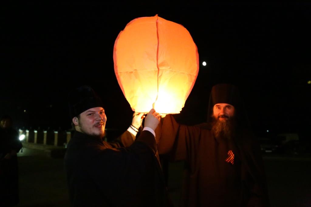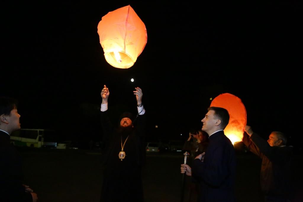 В завершение, инициативой Православного молодёжного движения, участники богослужения запустили 70 небесных фонариков – по числу лет, прошедших с первого дня празднования Великой Победы.