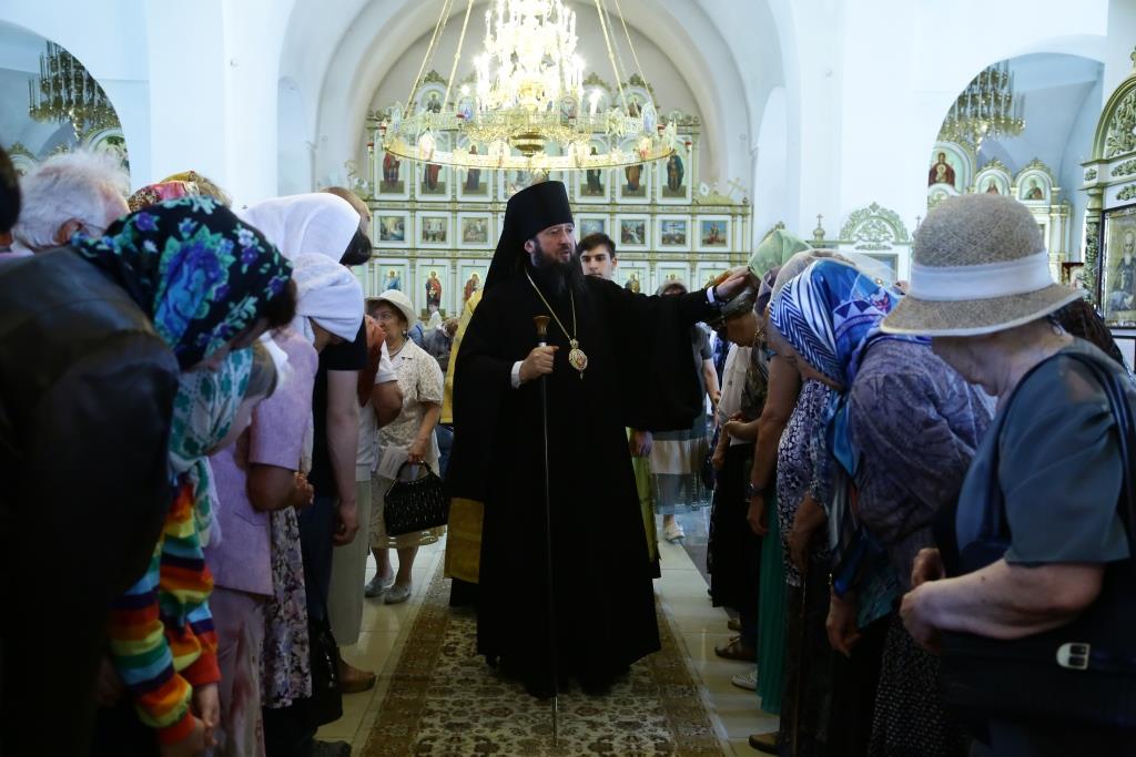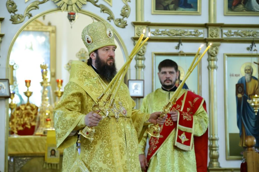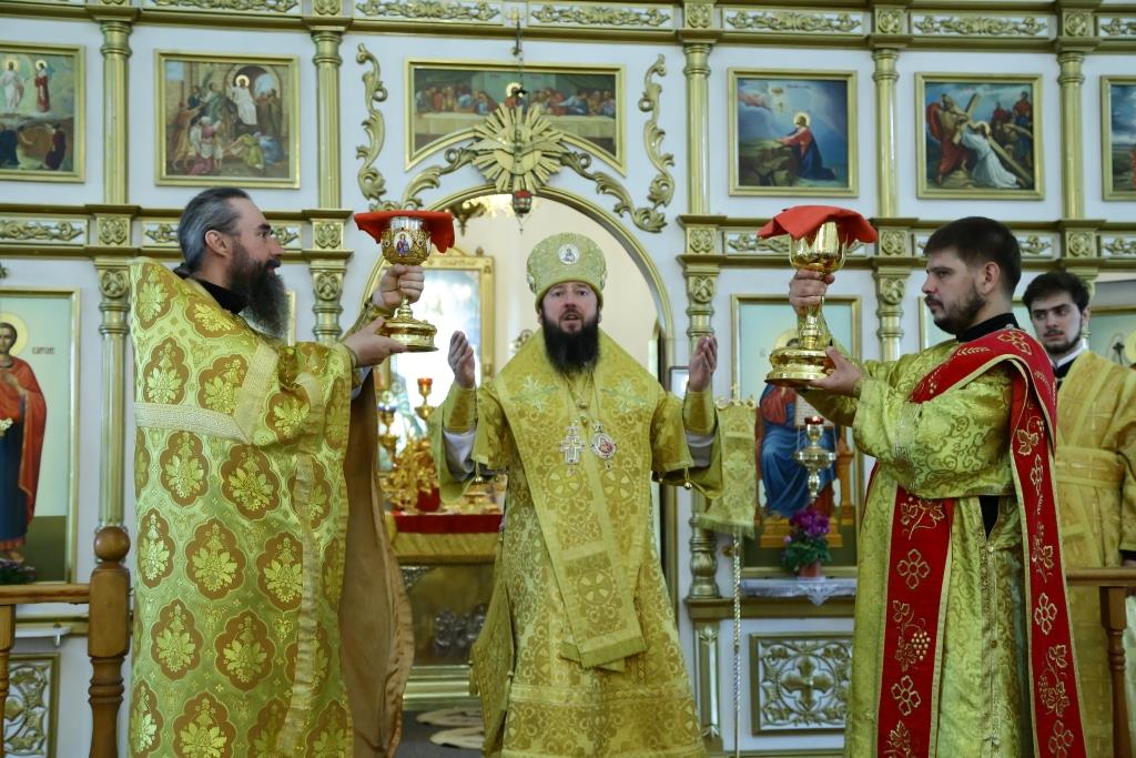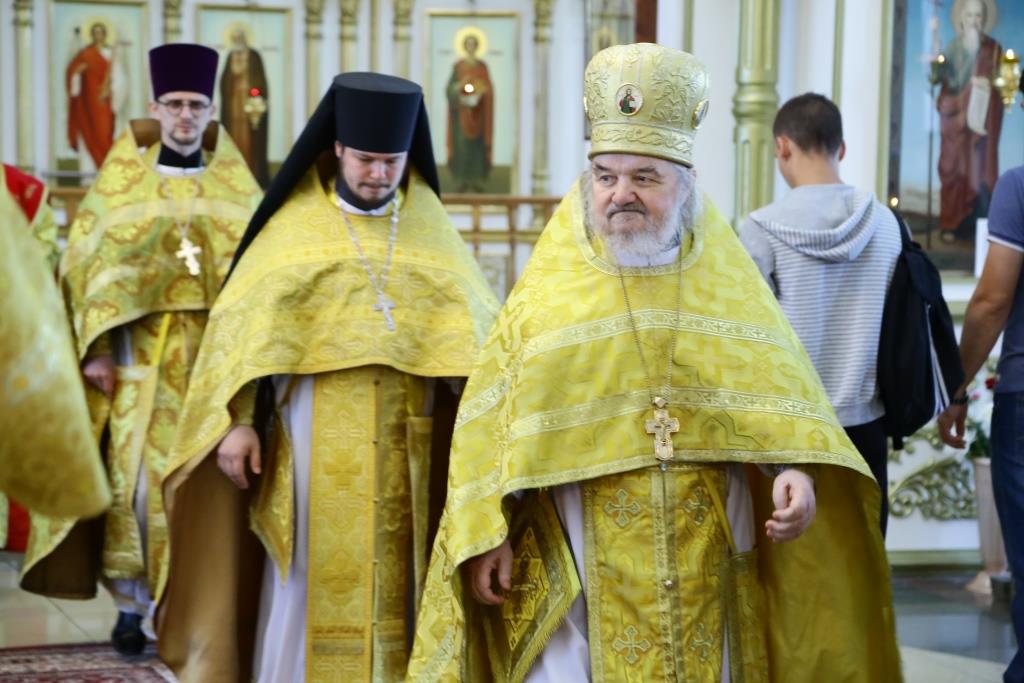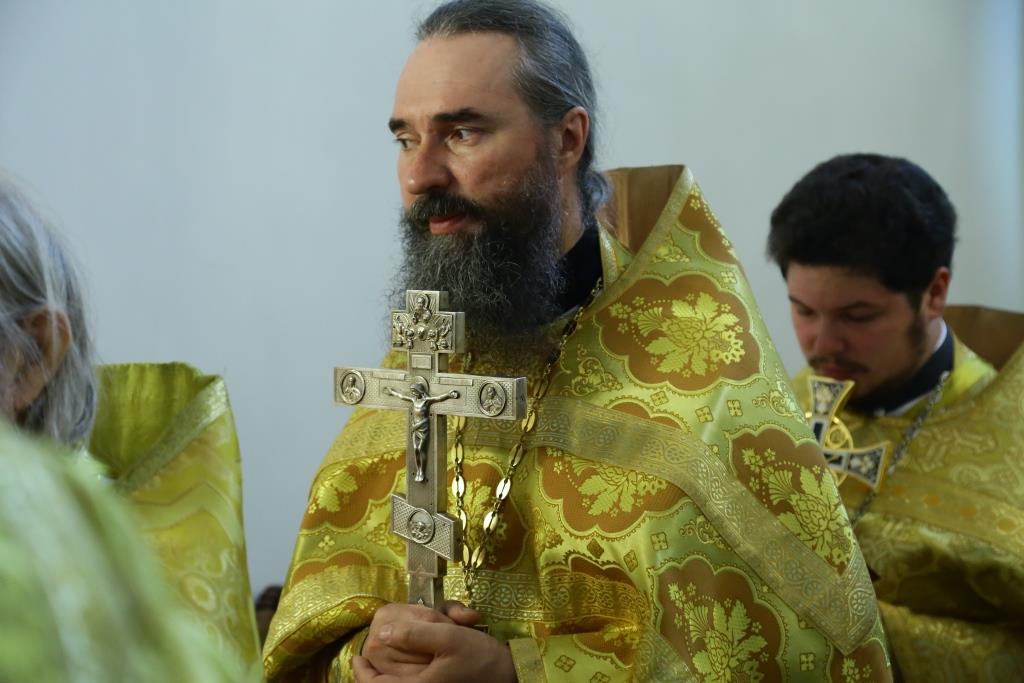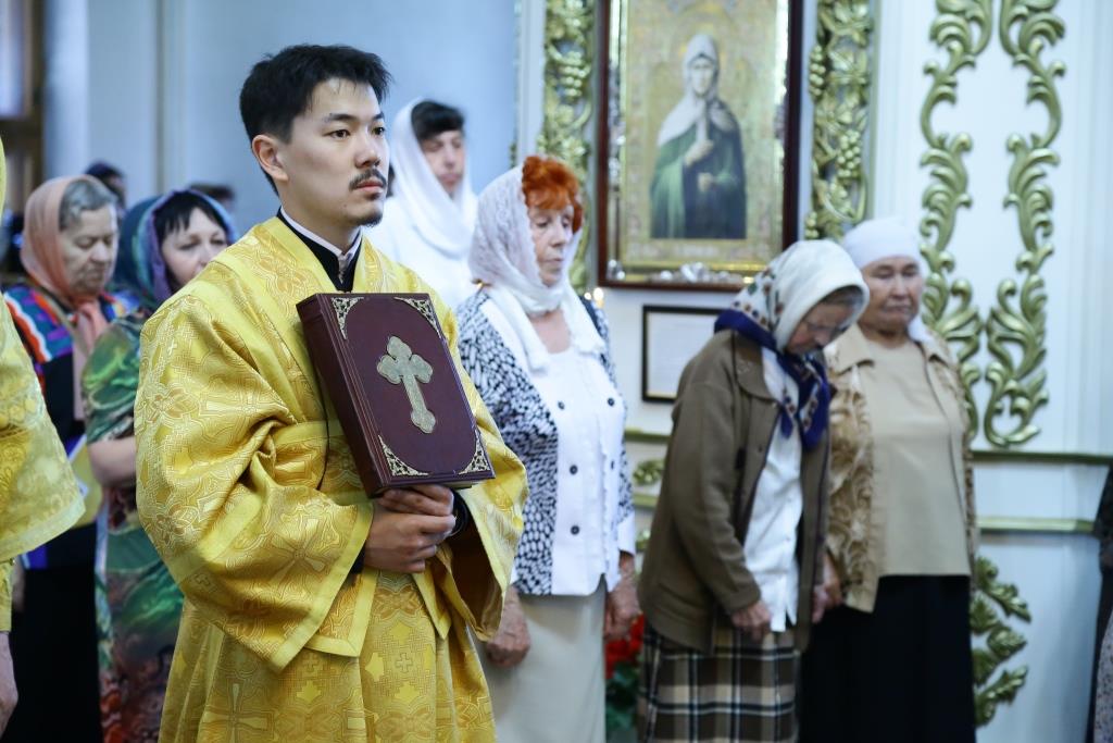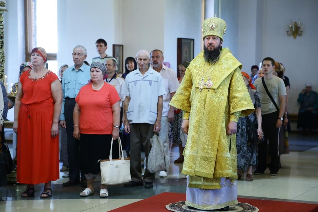 Его Преосвященству сослужили: духовник Усть-Каменогорской епархии архимандрит Спиридон (Теплухин), ключарь собора иеромонах Никодим (Авдеев), иеромонах Силуан Магилев), иерей Алексий Клепиков, заведующий канцелярией Усть-Каменогорского епархиального управления иерей Константин Дьяков.