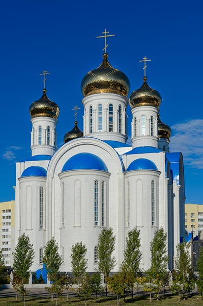 Всего храм имеет четыре престола: центральный престол верхнего храма посвящен Успению Пресвятой Богородицы; в южном боковом приделе – Архистратигу Божию Михаилу и прочим Небесным Силам бесплотным; в северном боковом - святым равноапостольным Кириллу и Мефодию, просветителям славянским; престол нижнего храма освящен в честь Собора новомучеников и исповедников Казахстанских.