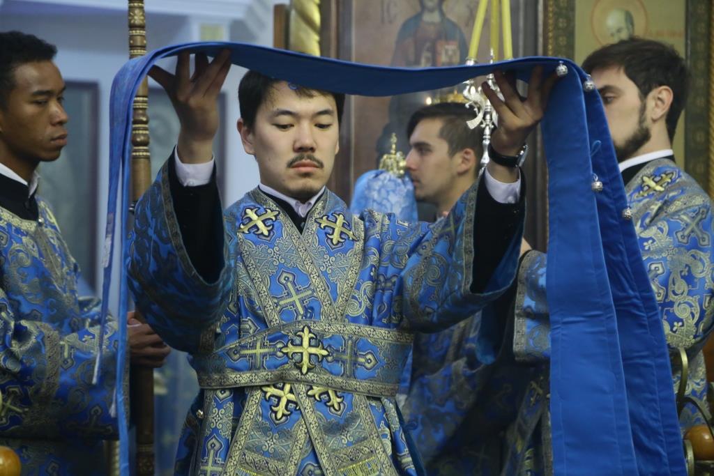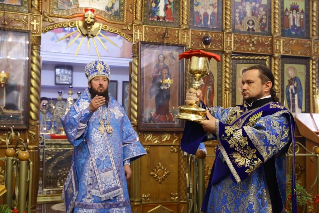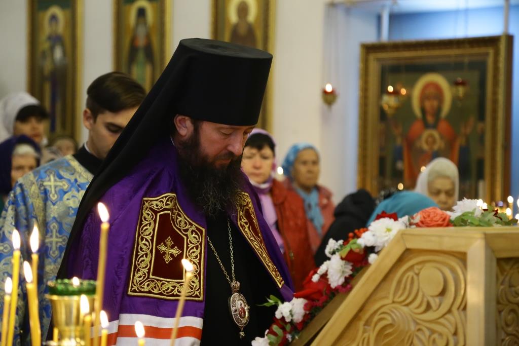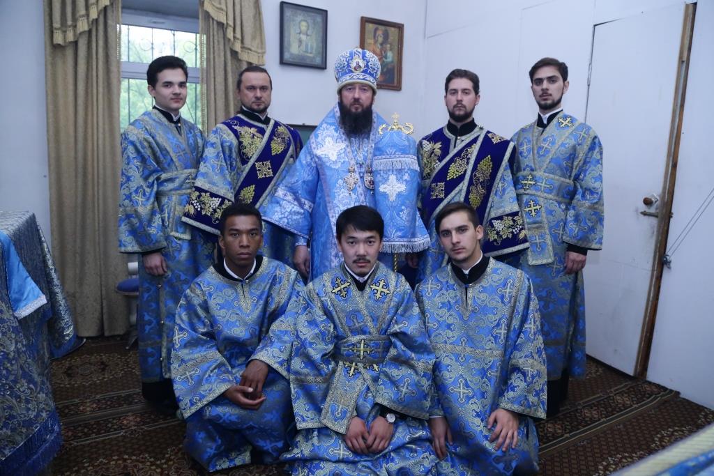 Архипастырю сослужили: духовник епархии архимандрит Спиридон (Теплухин), настоятель храма иерей Евгений Яганов, секретарь Владыки иеромонах Силуан (Магилев), настоятель Свято-Зиновьевского храма Усть-Каменогорска иерей Вячеслав Гутов. Диаконский чин возглавил протодиакон Андрей Дудник.