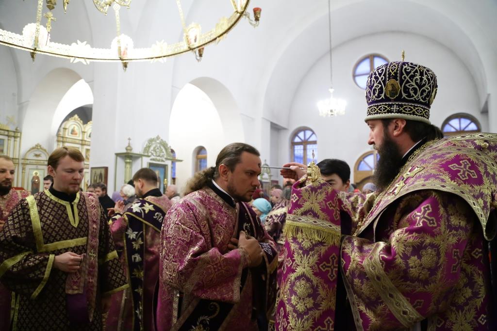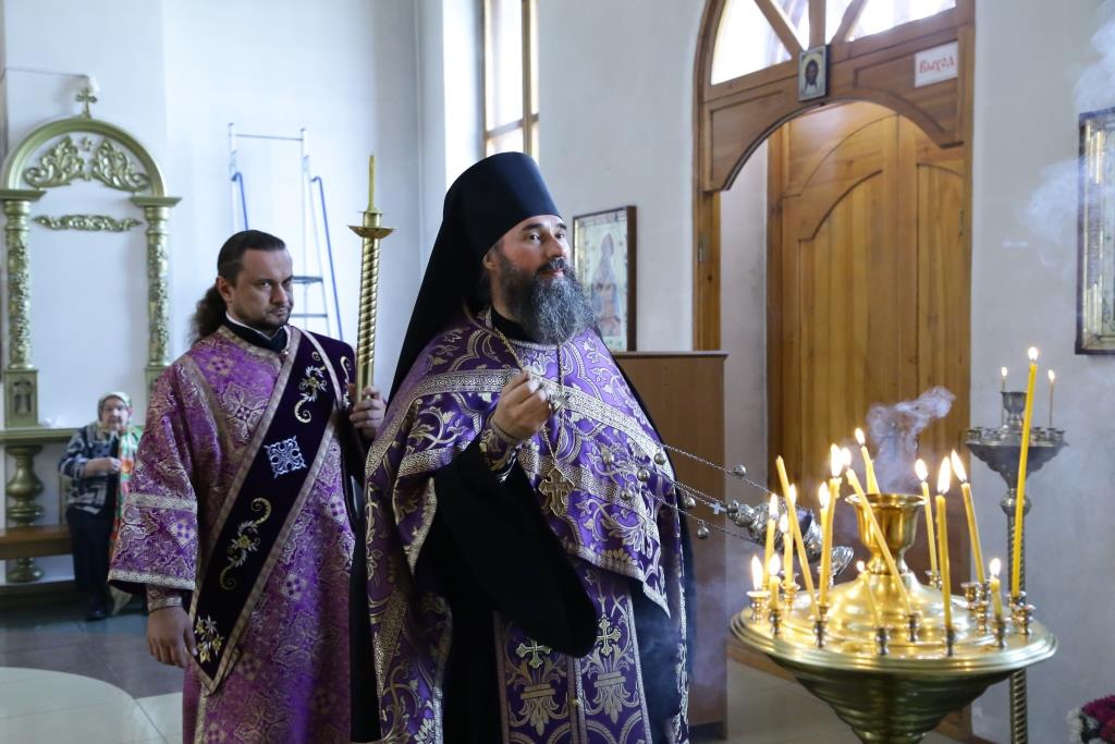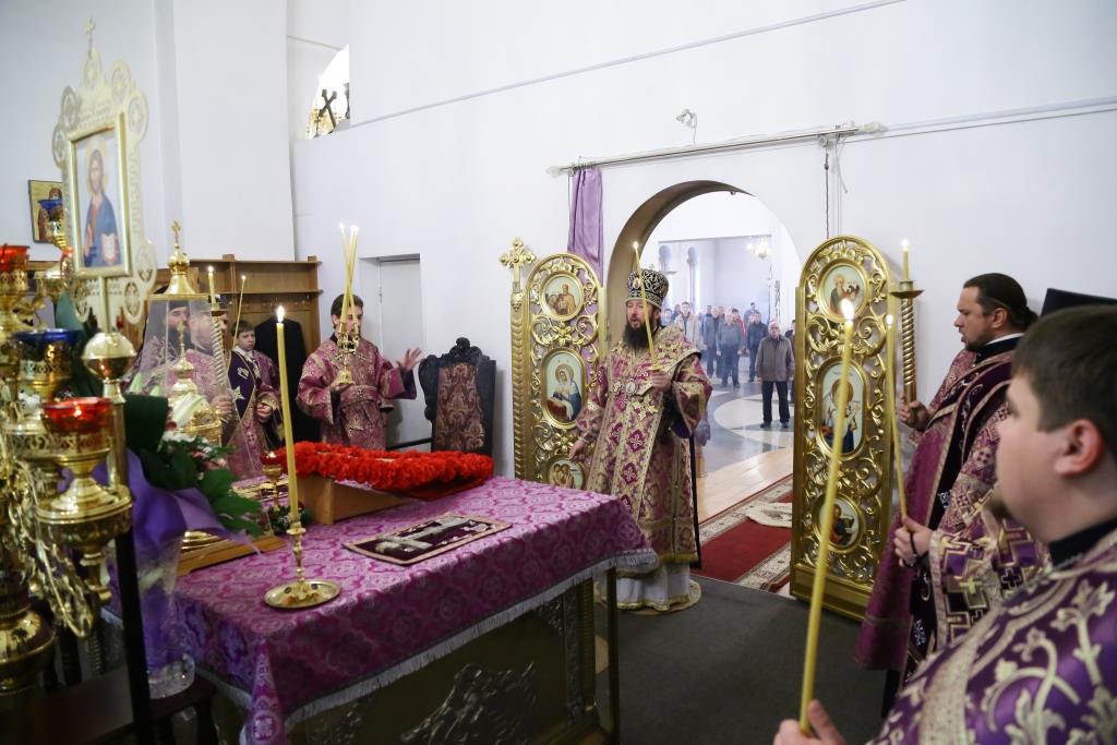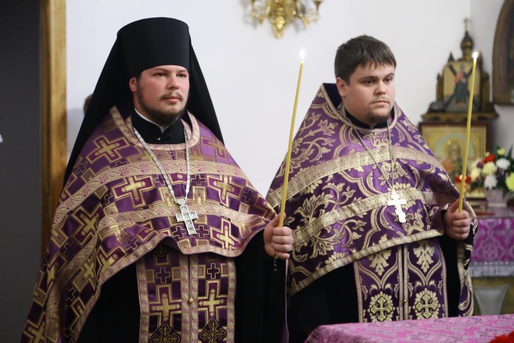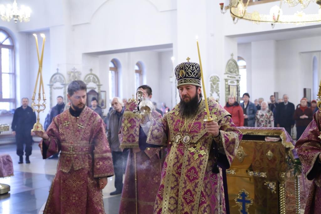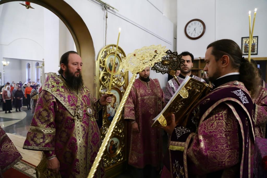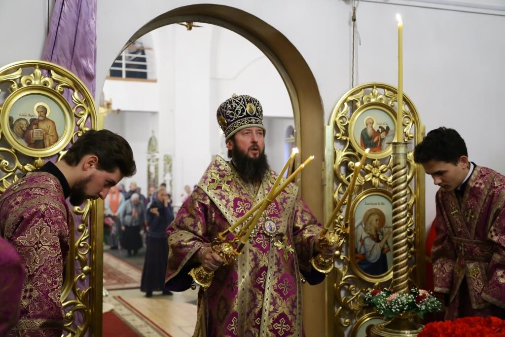 Его Преосвященству сослужили секретарь Управляющего епархией иеромонах Силуан (Магилёв), ключарь собора иеромонах Никодим (Авдеев), клирики кафедрального храма.
