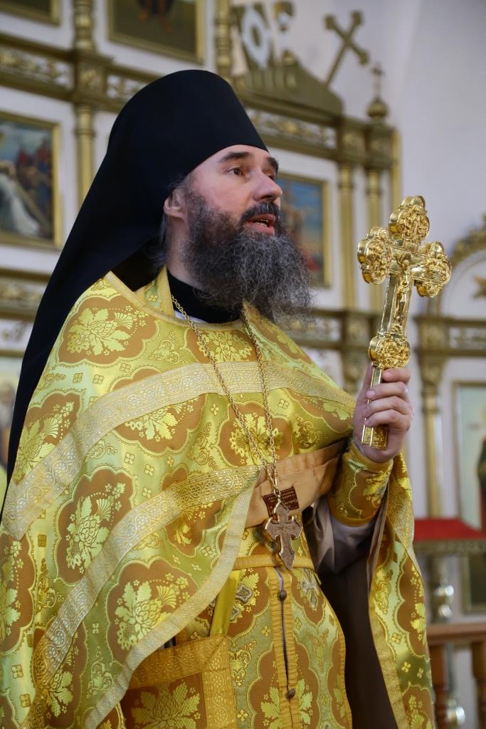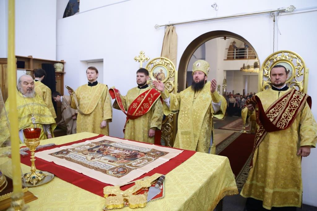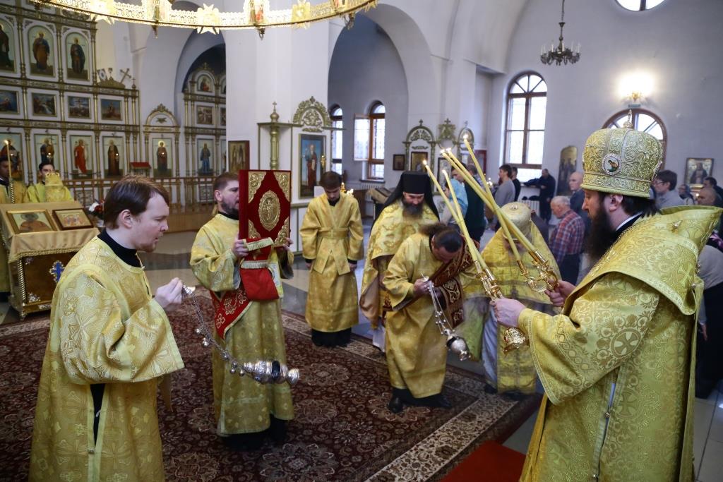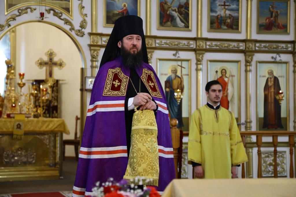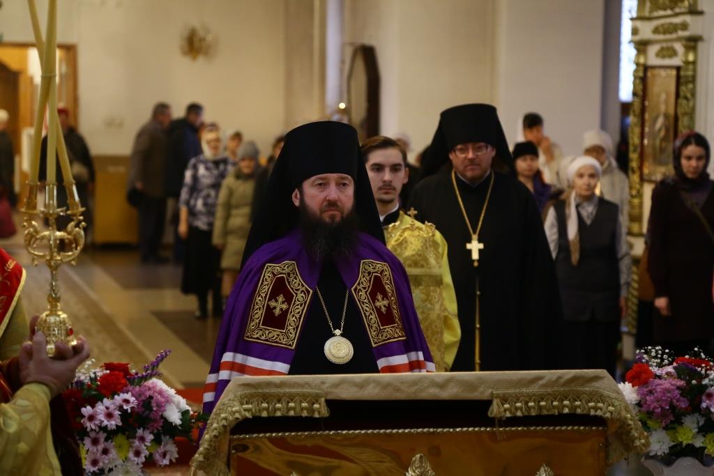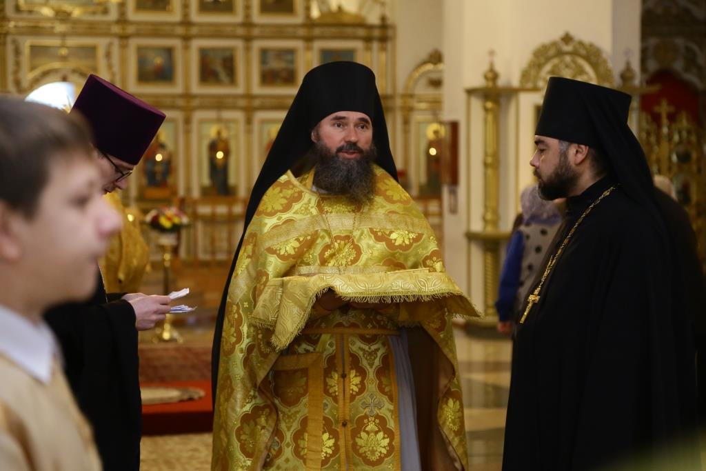 Архипастырю сослужили: духовник епархии архимандрит Спиридон (Теплухин), клирик Покровского храма города иеромонах Иустин (Ларионов), ключарь собор иеромонах Никодим (Авдеев), клирик храма иерей Константин Дьяков; протодиакон Андрей Дудник, диакон Георгий Сухобокий.