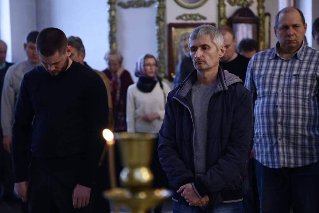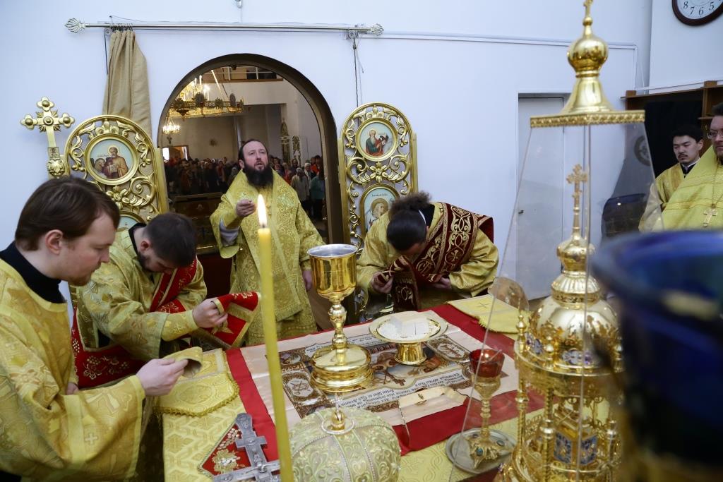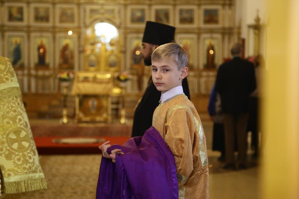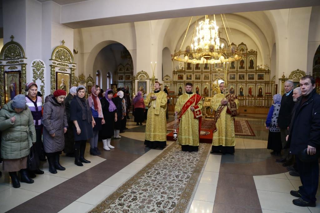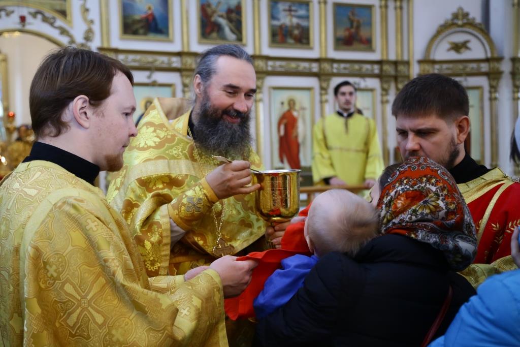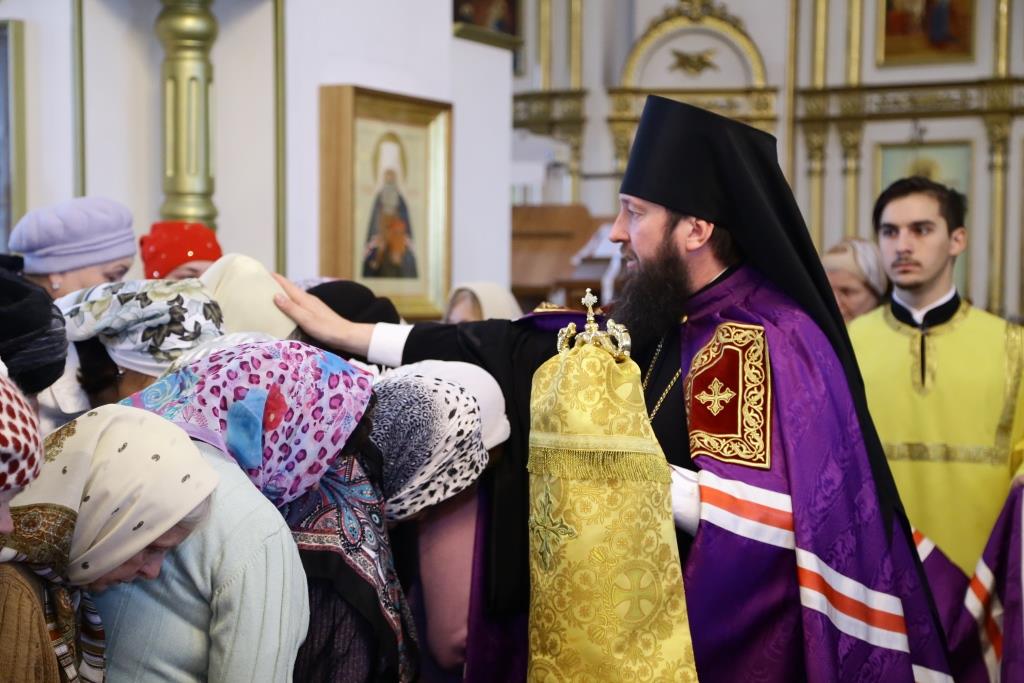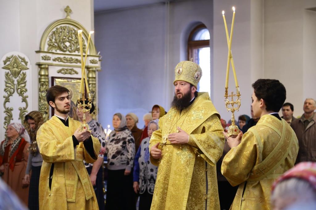 Архипастырю сослужили: духовник епархии архимандрит Спиридон (Теплухин), клирик Покровского храма города иеромонах Иустин (Ларионов), ключарь собор иеромонах Никодим (Авдеев), клирик храма иерей Константин Дьяков; протодиакон Андрей Дудник, диакон Георгий Сухобокий.