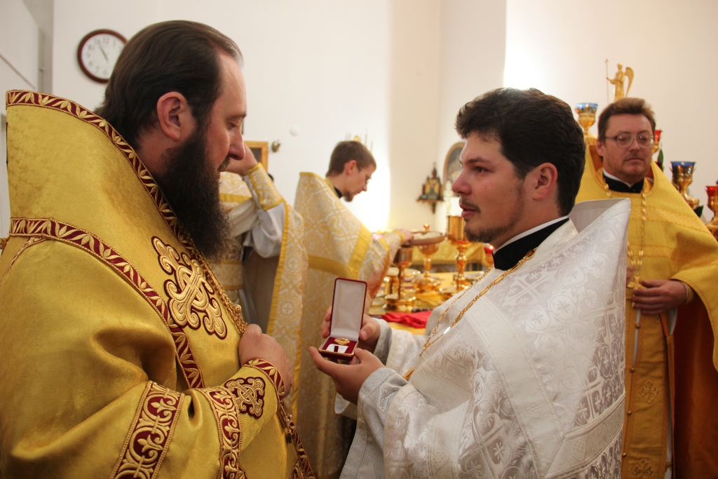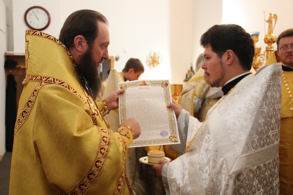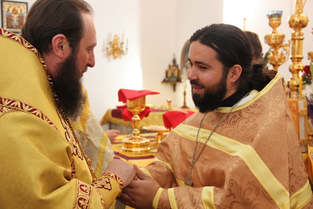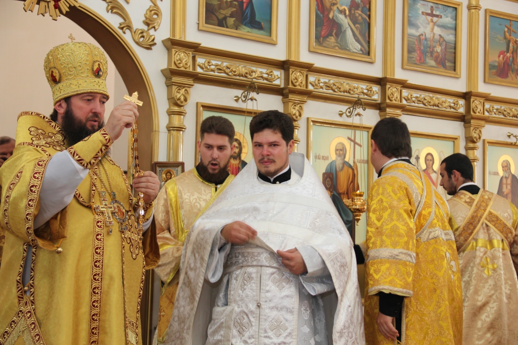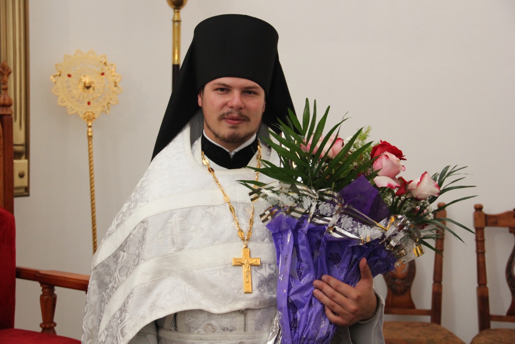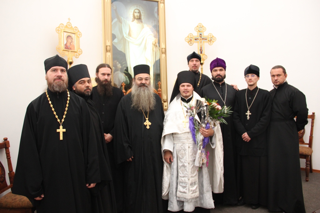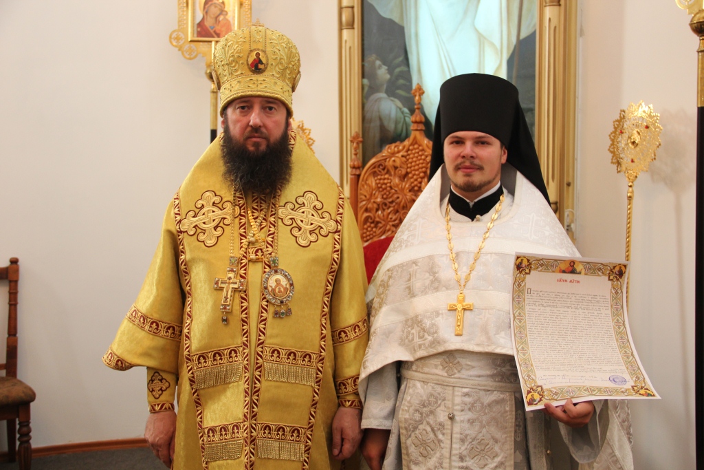 За Божественной Литургией Преосвященный Архипастырь рукоположил в сан пресвитера с возложением набедренника и наперсного креста выпускника Московской Духовной Академии, насельника Свято-Троицкого мужского монастыря, клирика Свято-Андреевского кафедрального собора иеродиакона Силуана (Магилева). Иеромонаху Силуану предстоит нести свое пастырское служение в клире духовенства кафедрального собора.