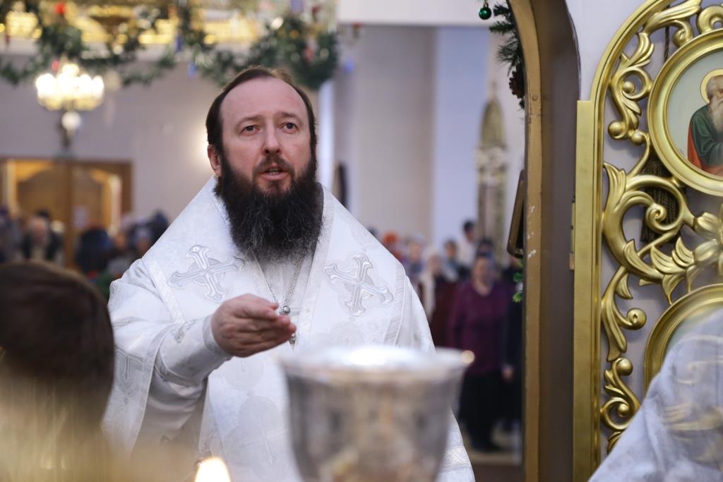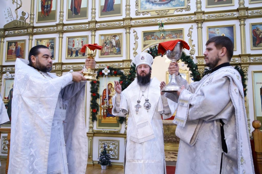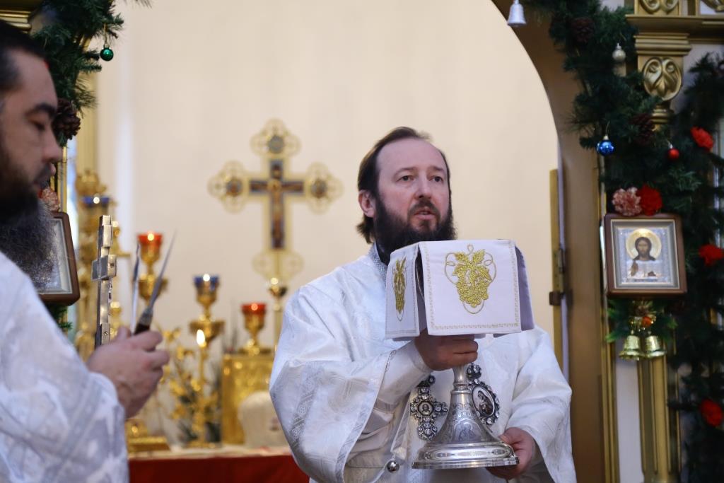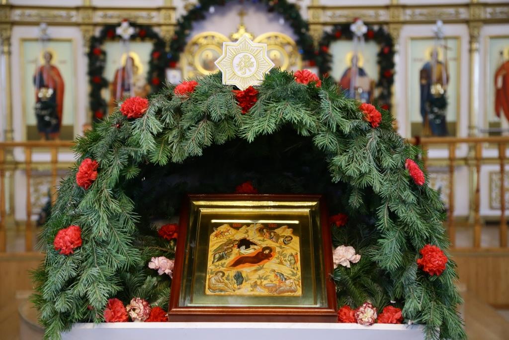 По окончании Литургии перед свечой, знаменующей Вифлеемскую звезду, были пропеты тропарь и кондак праздника Рождества Христова.