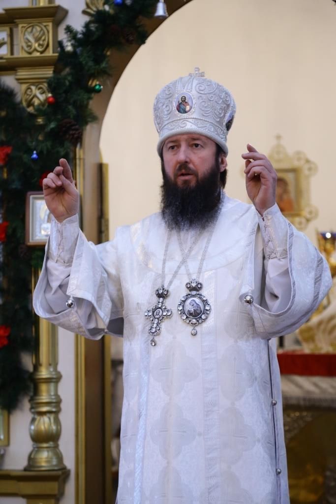 «Всечестные отцы, дорогие братья и сестры! Всех вас сердечно приветствую и поздравляю с Рождественским сочельником! Сегодня через тысячелетия доносятся до нас слова ветхозаветных пророчеств о пришествии в мир Христа Спасителя, и основным литургическим мотивом сегодняшнего богoслужения было ожидание. Ожидание чуда, ожидание радостной вести о том, что началось дело нашего спасения! Рождение Богомладенца Христа Спасителя – это свидетельство неизреченной любви, которую Творец вселенной явил роду человеческому «так возлюбил Бог мир, что отдал Сына Своего Единородного, дабы всякий верующий в Него, не погиб, но имел жизнь вечную» (Ин. 3:16)
