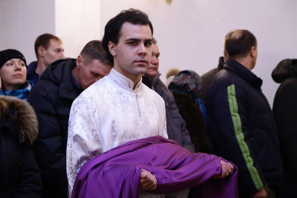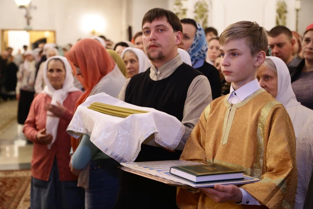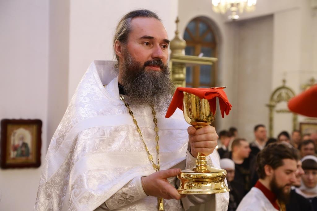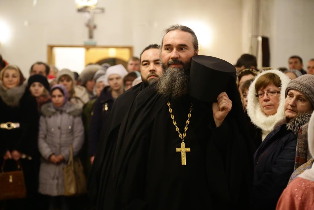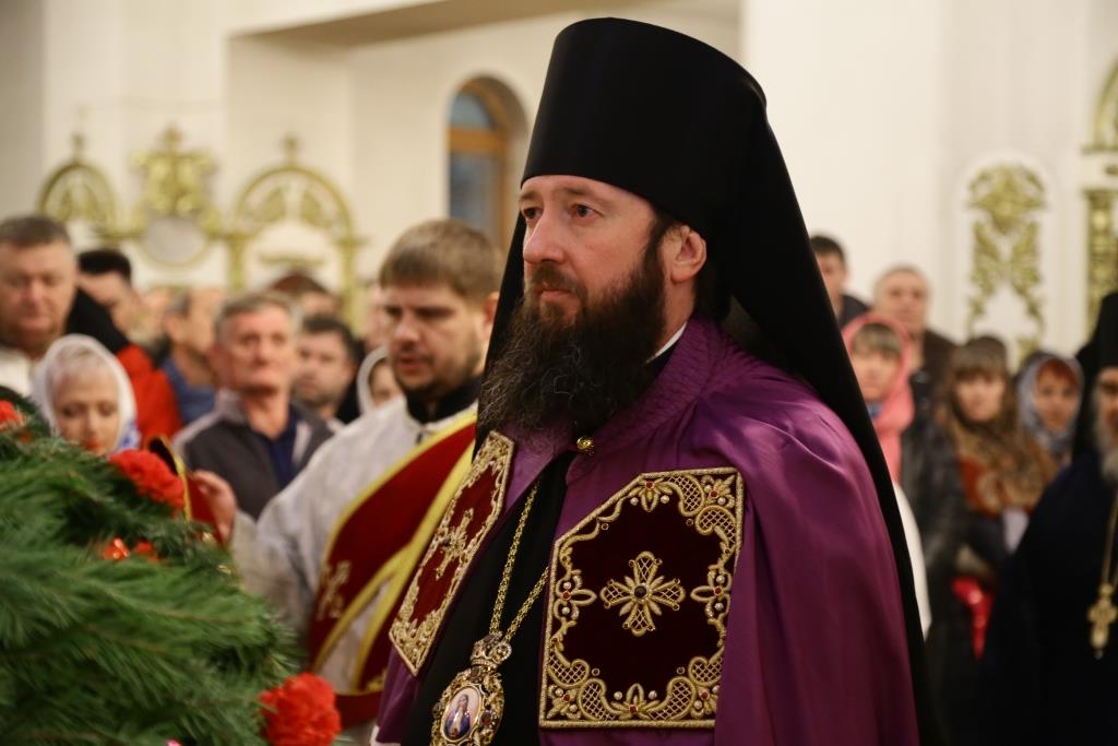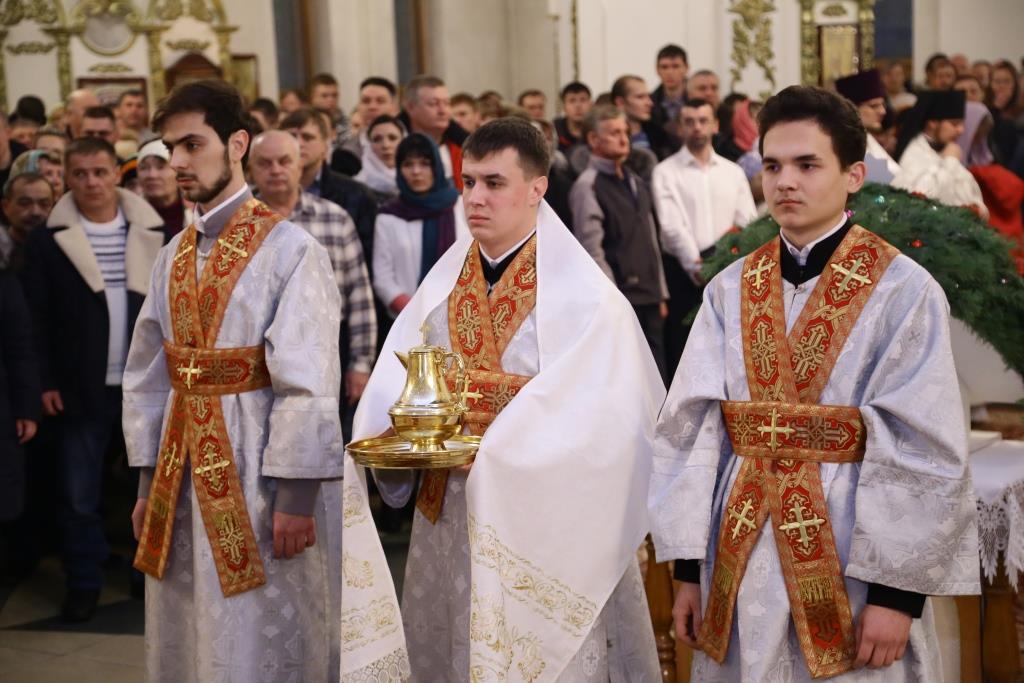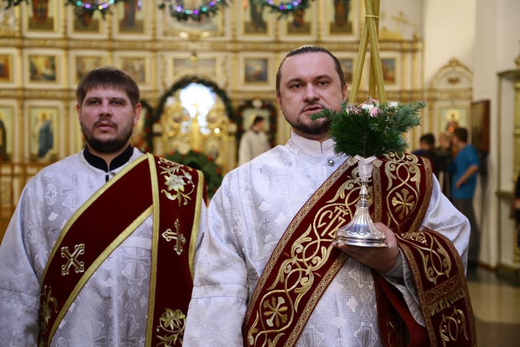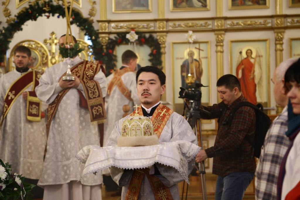 За ночной Божественной Литургией Его Преосвященству сослужили: духовник Свято-Троицкого Усть-Каменогорского мужского монастыря архимандрит Спиридон (Теплухин), ключарь Андреевского собора иеромонах Никодим (Авдеев), иеромонах Севастиан (Андрющенко), заведующий канцелярией епархии иерей Константин Дьяков; диаконский чин возглавил протодиакон Георгий Засыпкин.