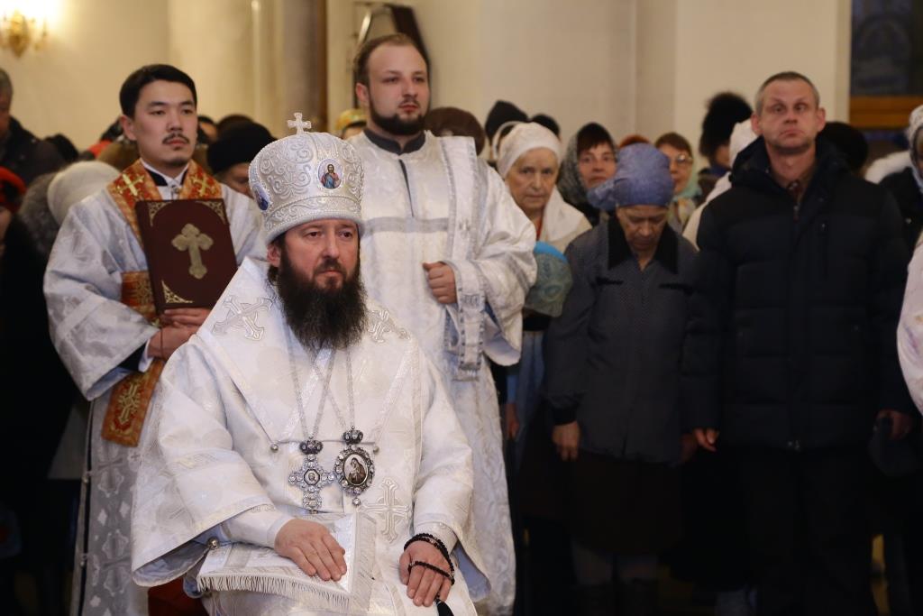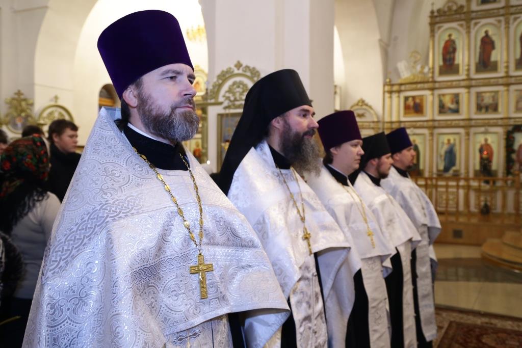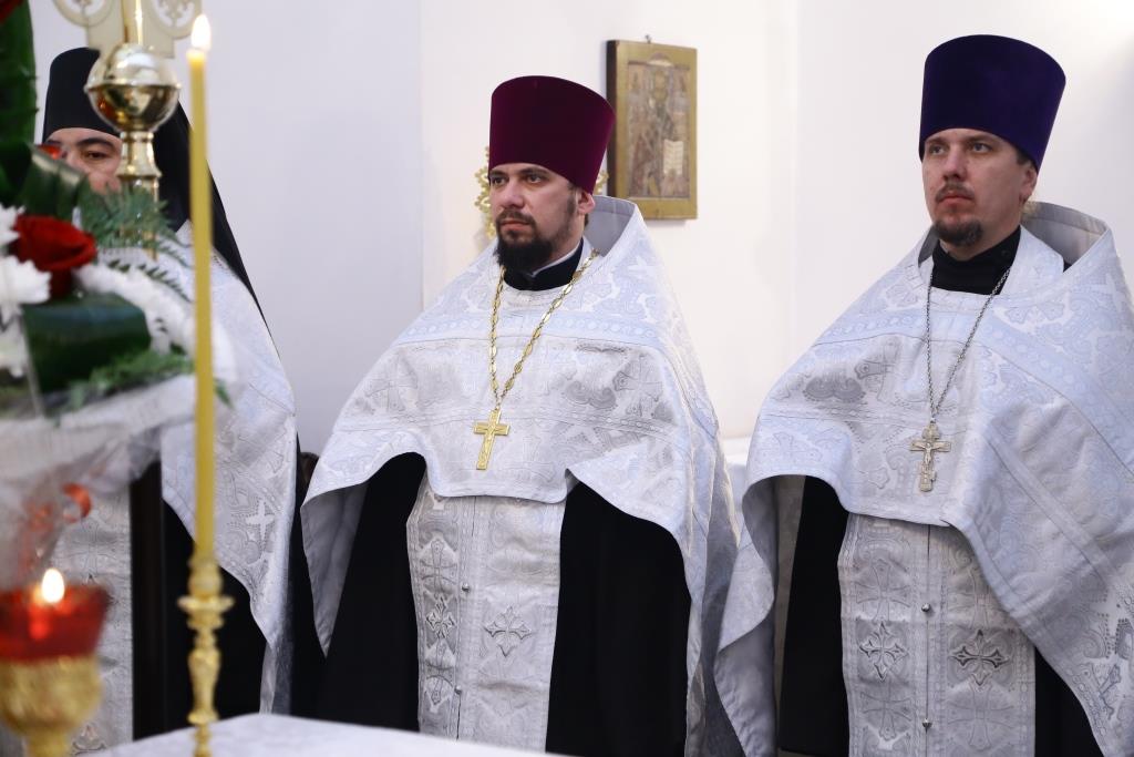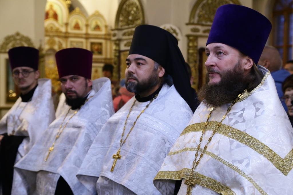 Его Преосвященству сослужили: благочинный Усть-Каменогорского церковного округа иерей Алексий Анищенко, и.о. секретаря епархии иерей Евгений Яганов, настоятели и духовенство храмов столицы Прииртышья, руководители епархиальных отделов в священном сане.