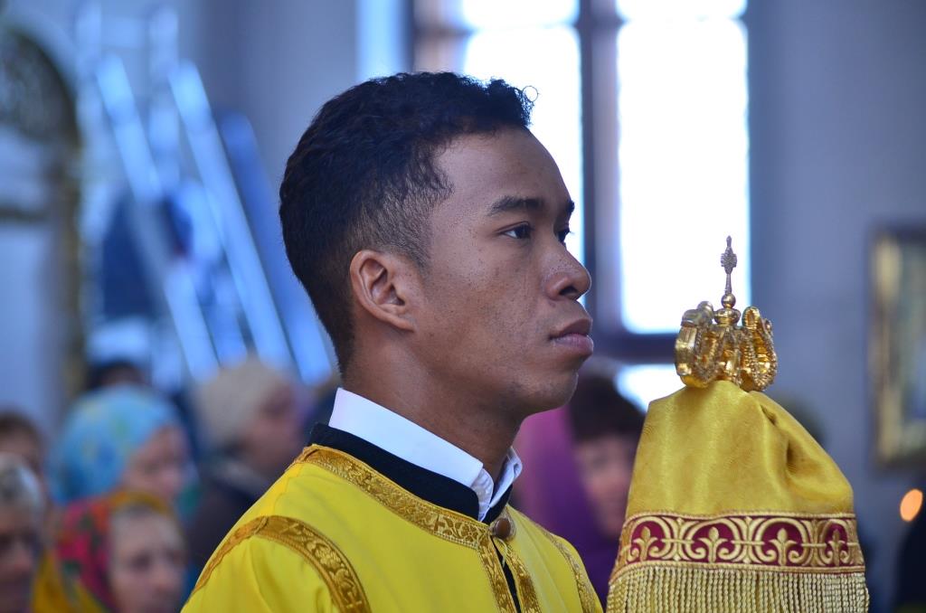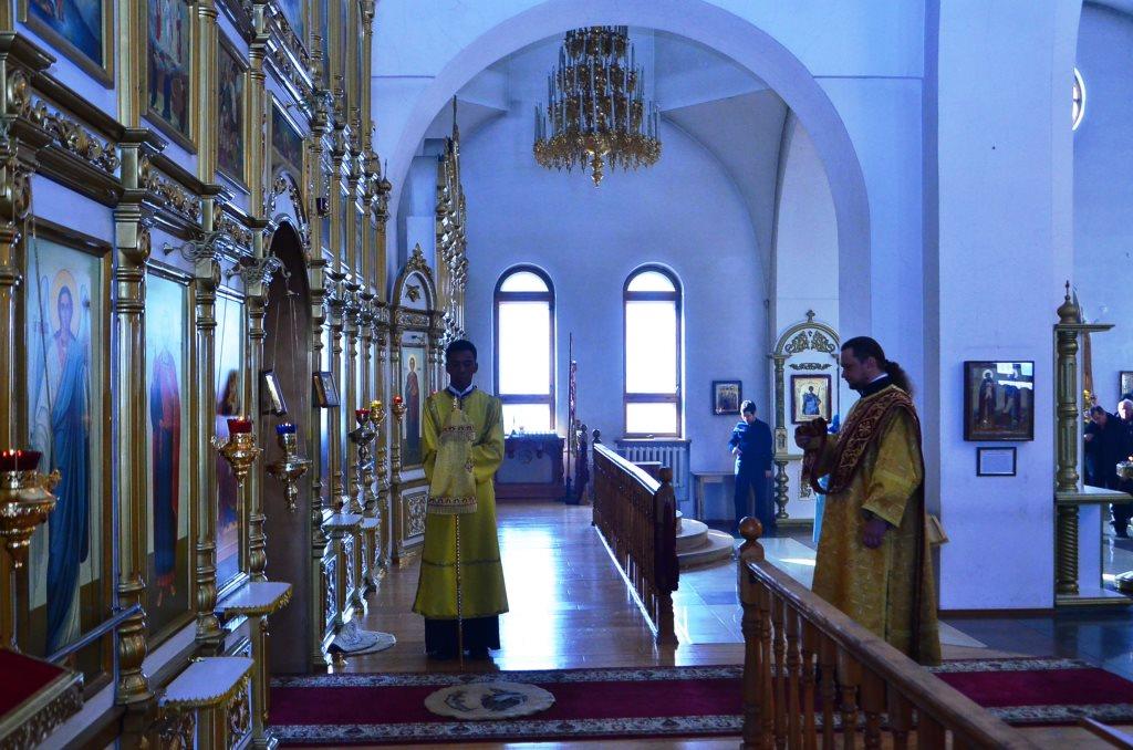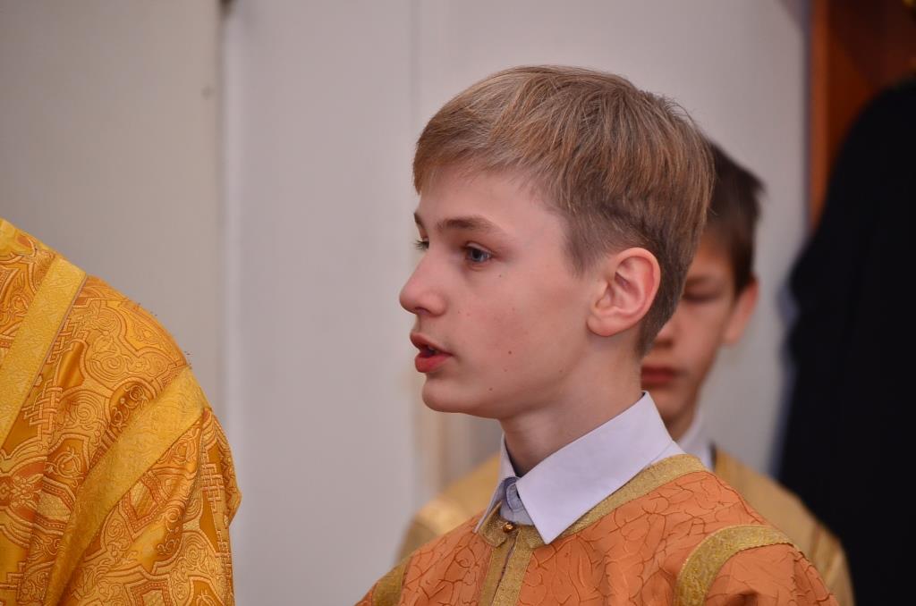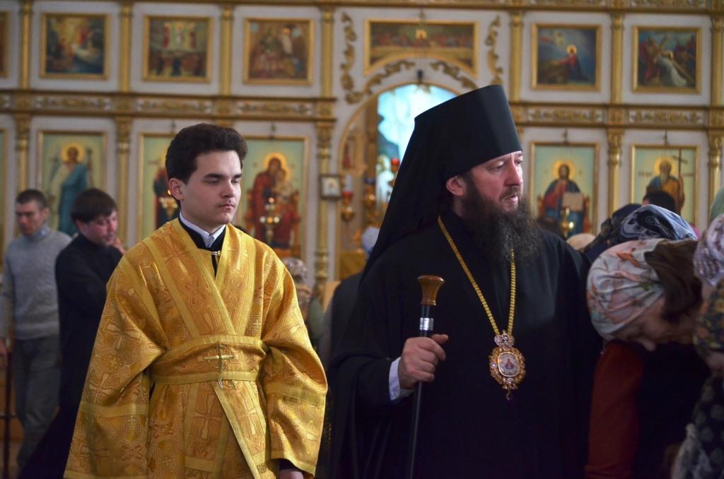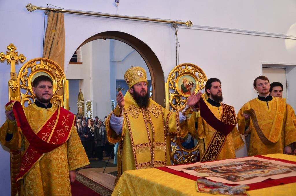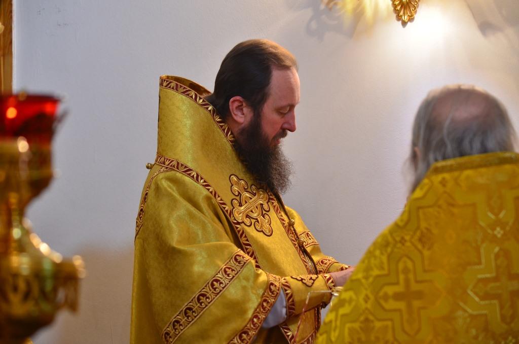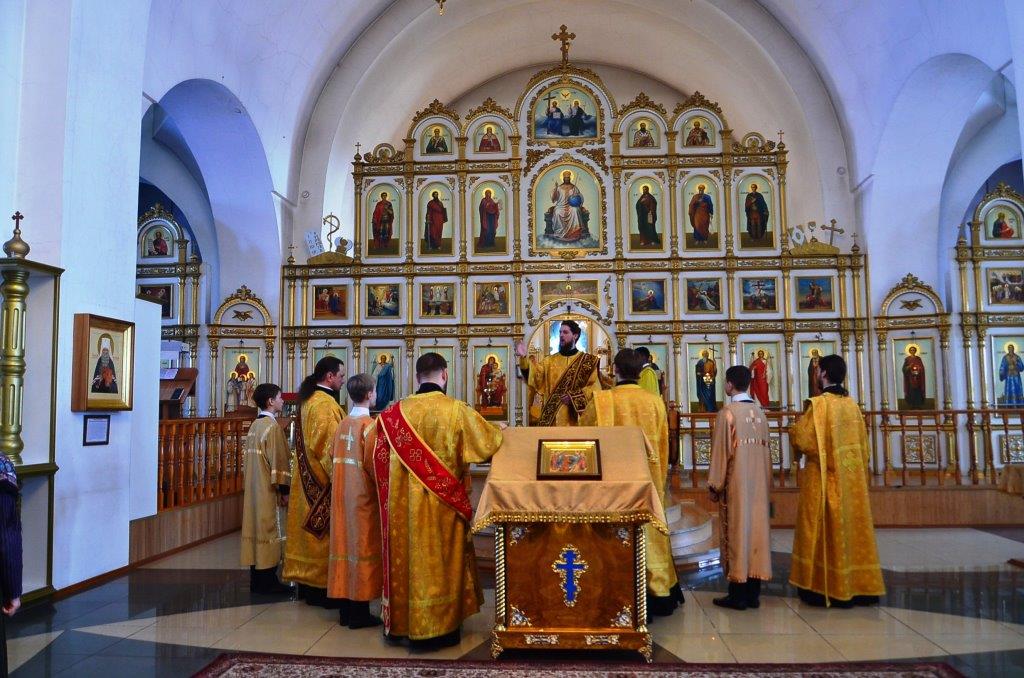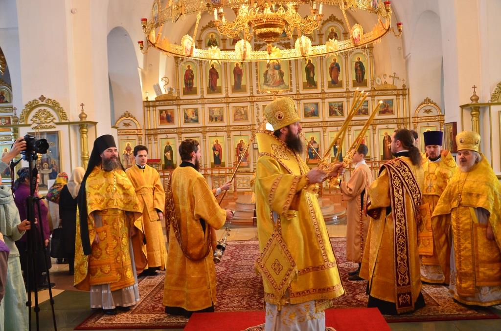 Архипастырю сослужили: духовник епархии архимандрит Спиридон (Теплухин), ключарь собора иеромонах Никодим (Авдеев), клирик собора иерей Алексий Клепиков, протодиаконы Георгий Засыпкин и Андрей Дудник, иеродиаконы Мефодий (Шевчук) и Тимофей (Хитрич), диакон Георгий Сухобокий. Песнопения Божественной Литургии исполнял хор кафедрального собора под управлением регента В. Фёдоровой.