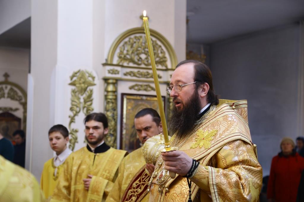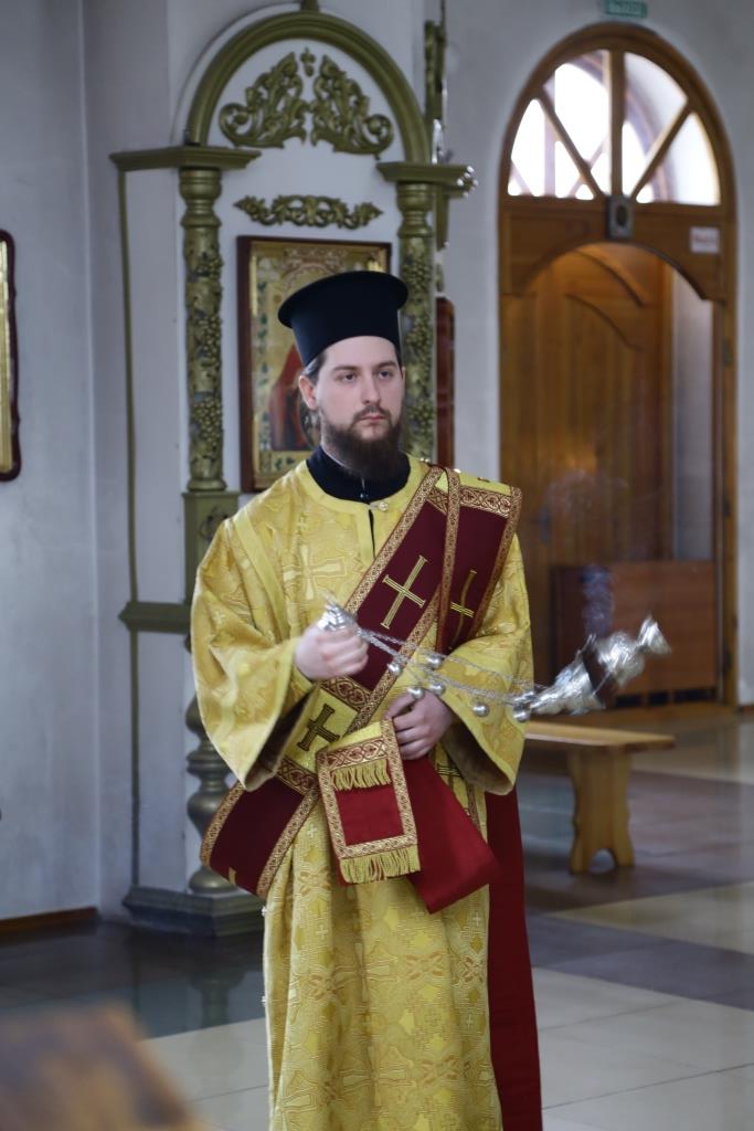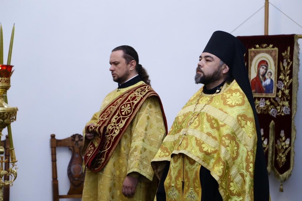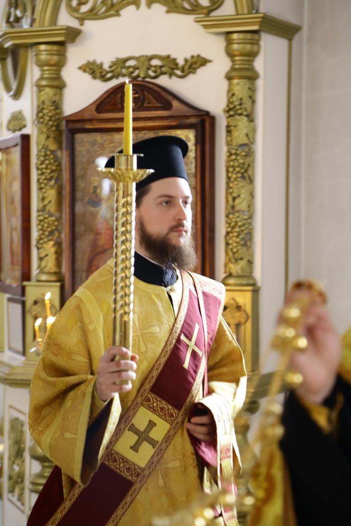 Владыке епископу сослужили: ключарь кафедрального собора иеромонах Никодим (Авдеев), заведующий канцелярией епархиального управления иерей Константин Дьяков, клирик собора иеромонах Севастиан (Андрющенко). Диконский чин возглавил протодиакон Андрей Дудник.