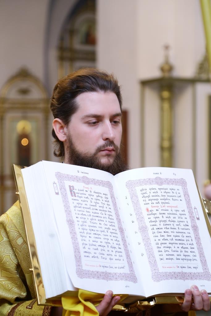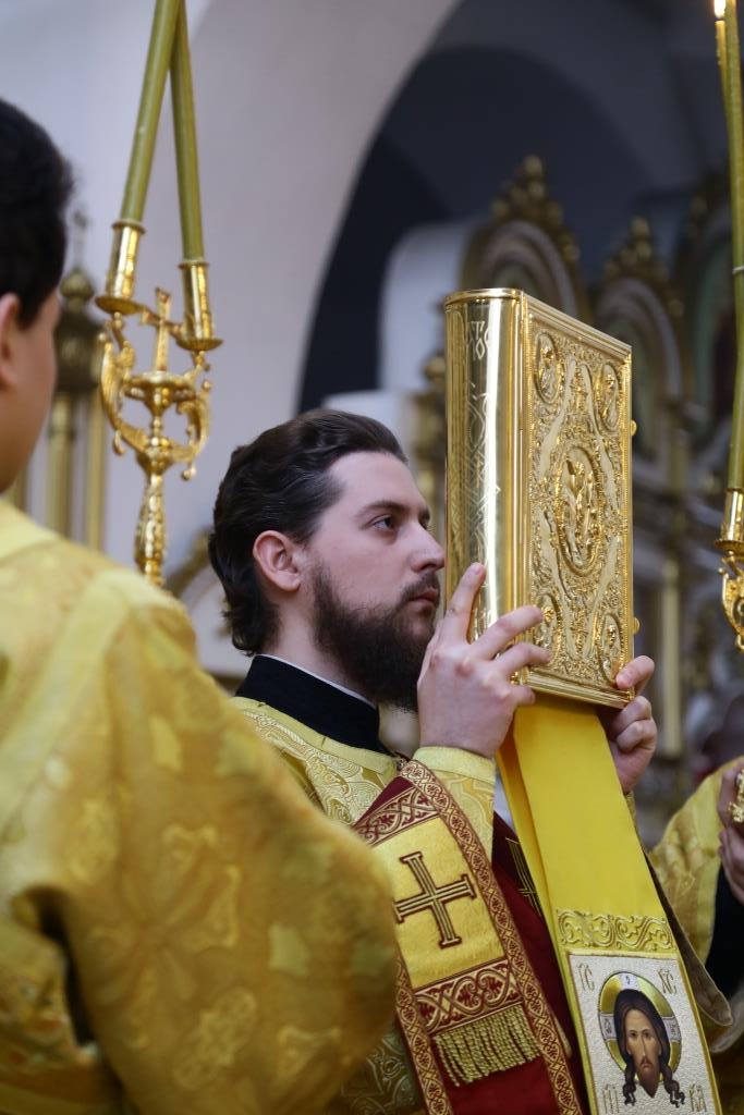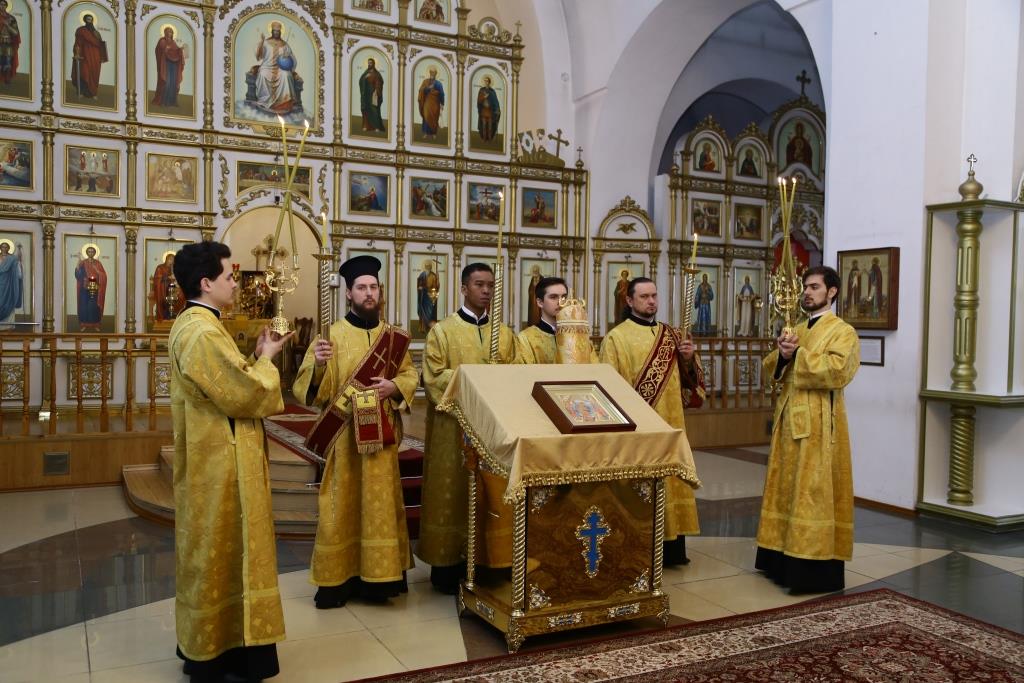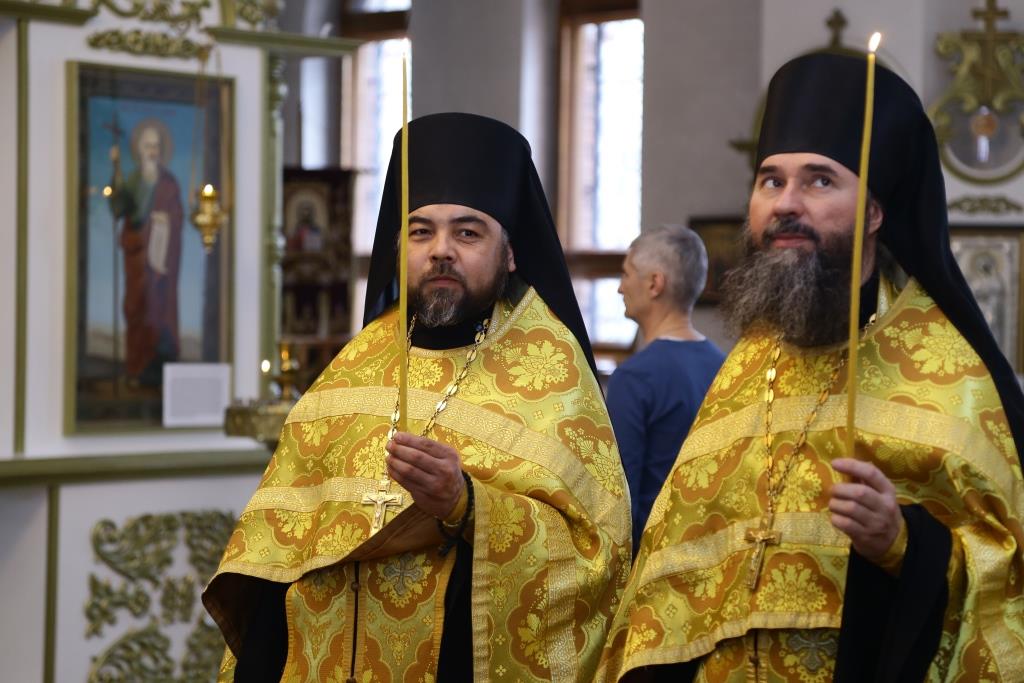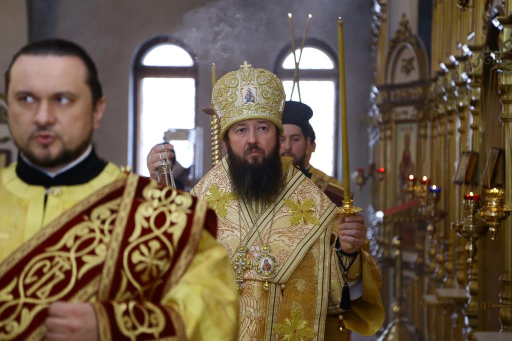 Владыке епископу сослужили: ключарь кафедрального собора иеромонах Никодим (Авдеев), заведующий канцелярией епархиального управления иерей Константин Дьяков, клирик собора иеромонах Севастиан (Андрющенко). Диконский чин возглавил протодиакон Андрей Дудник.