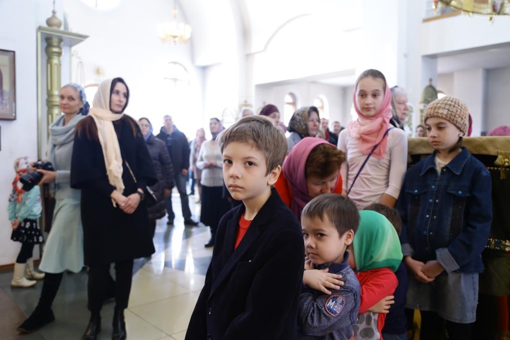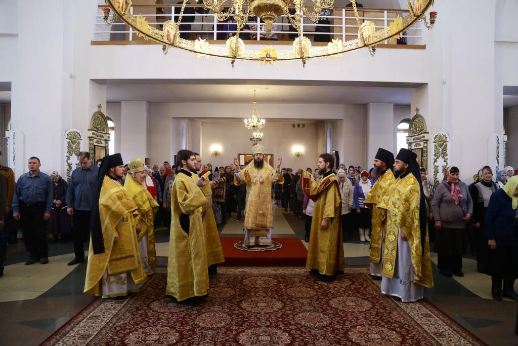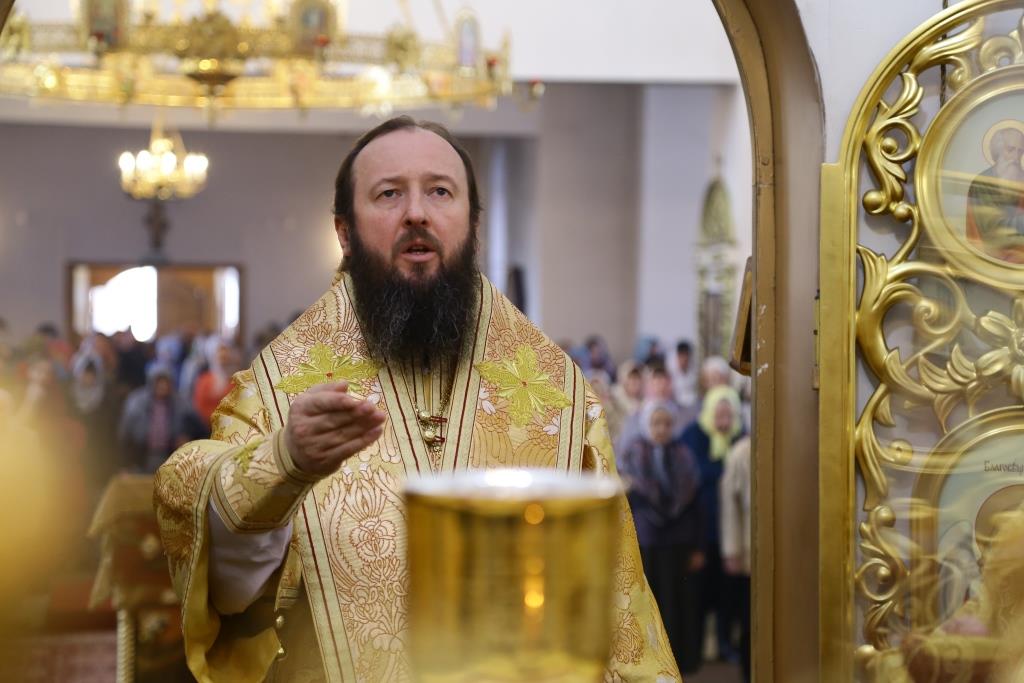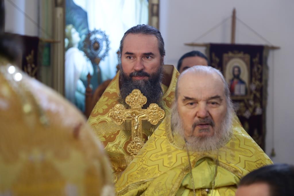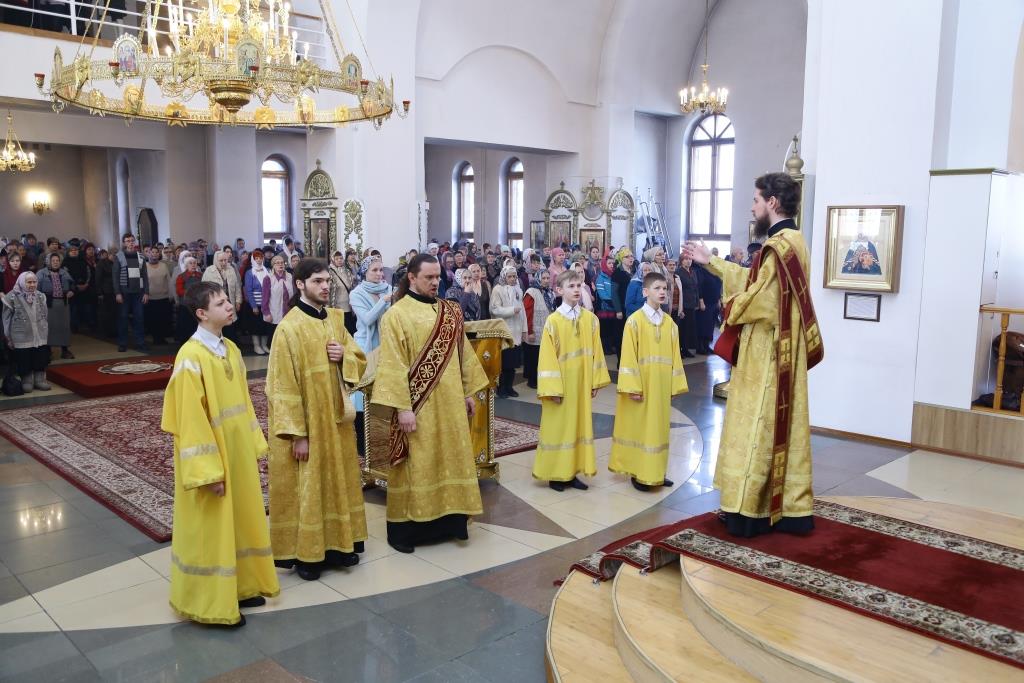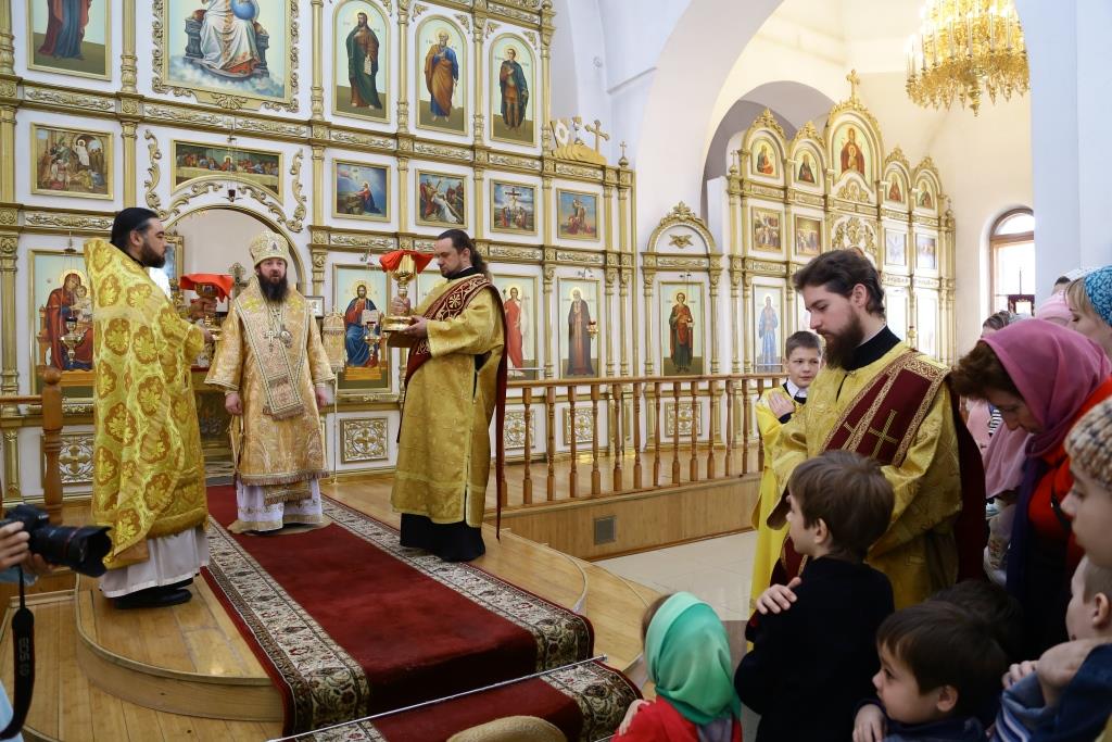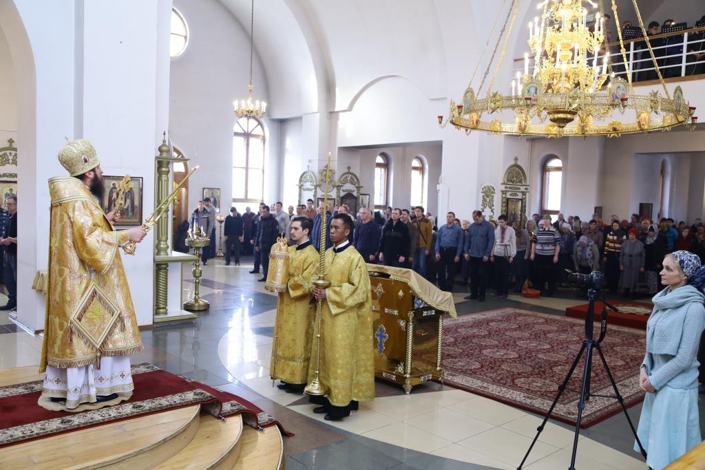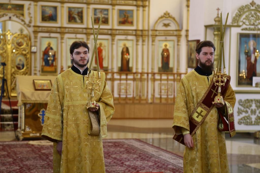 В воскресный день Архипастырю сослужили: духовник епархии архимандрит Спиридон (Теплухин), ключарь кафедрального собора иеромонах Никодим (Авдеев), клирик собора иеромонах Севастиан (Андрющенко). Диаконский чин возглавил протодиакон Андрей Дудник.
