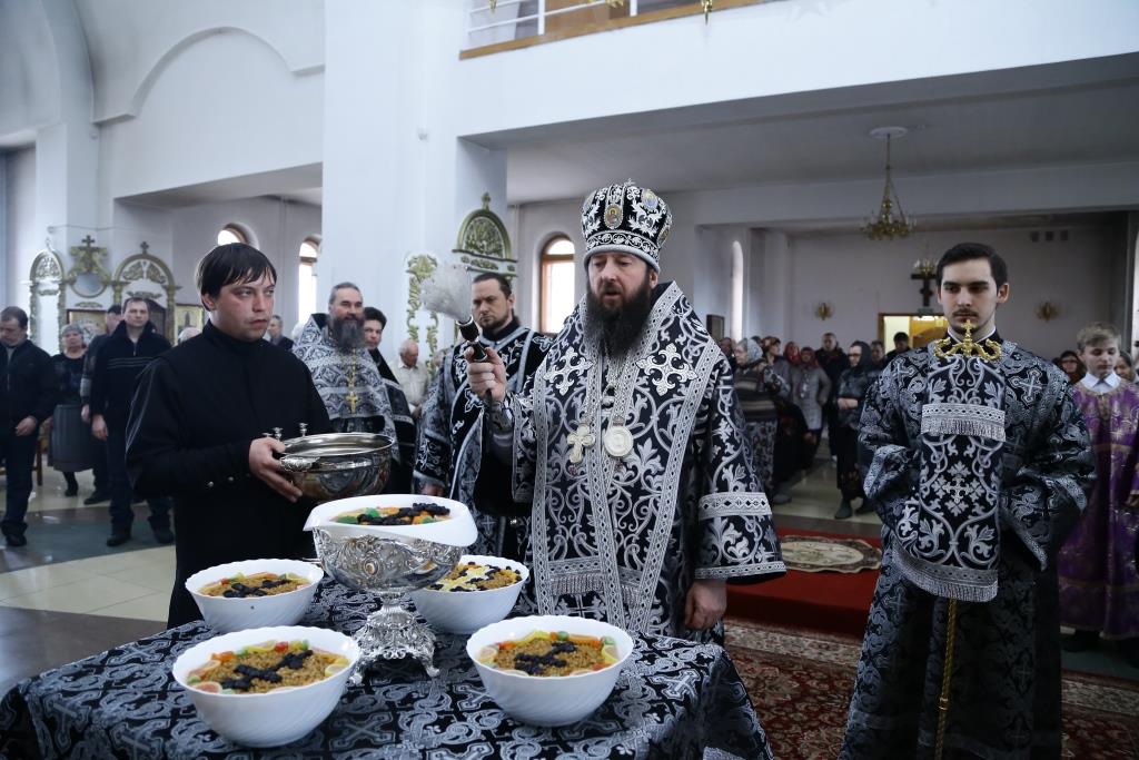 После заамвонной молитвы Архипастырь с клириками воспел молебный канон великомученику Феодору Тирону и совершил чин освящения колива.