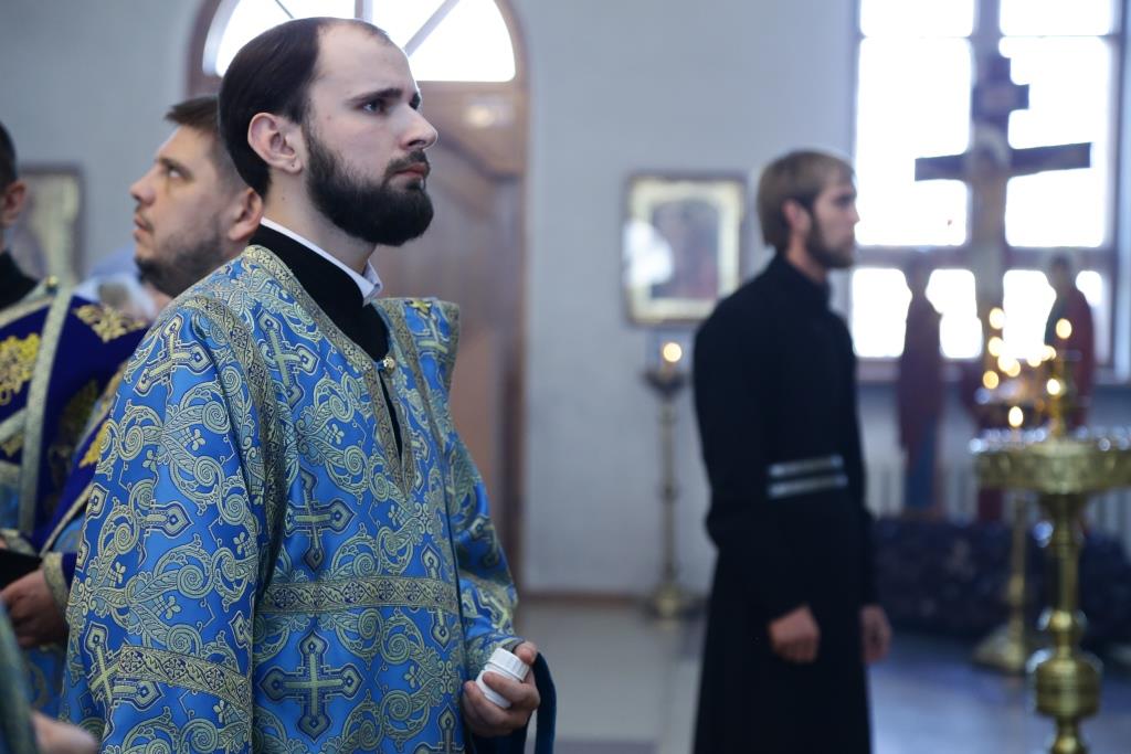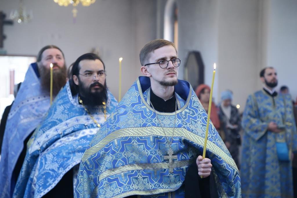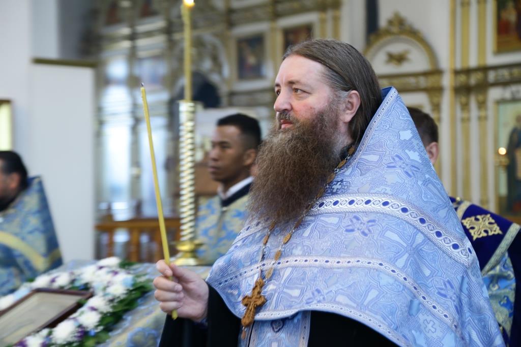 Его Преосвященству сослужили: духовник Знаменско-Петропавловского женского монастыря игумен Аникита (Макаров), ключарь кафедрального собора иеромонах Никодим (Авдеев), клирики собора иерей Алексий Клепиков, иеромонах Севастиан (Андрющенко), иерей Константин Дьяков, настоятель Пророко-Илиинского храма поселка Урджар иерей Александр Меринов, протодиаконы Георгий Засыпкин и Андрей Дудник, иеродиаконы Мануил (Чабанов) и Тимофей (Хитрич).
