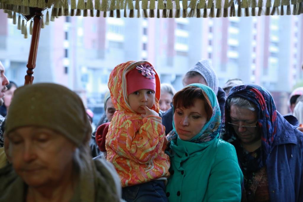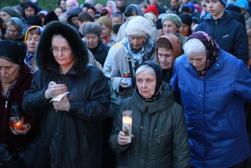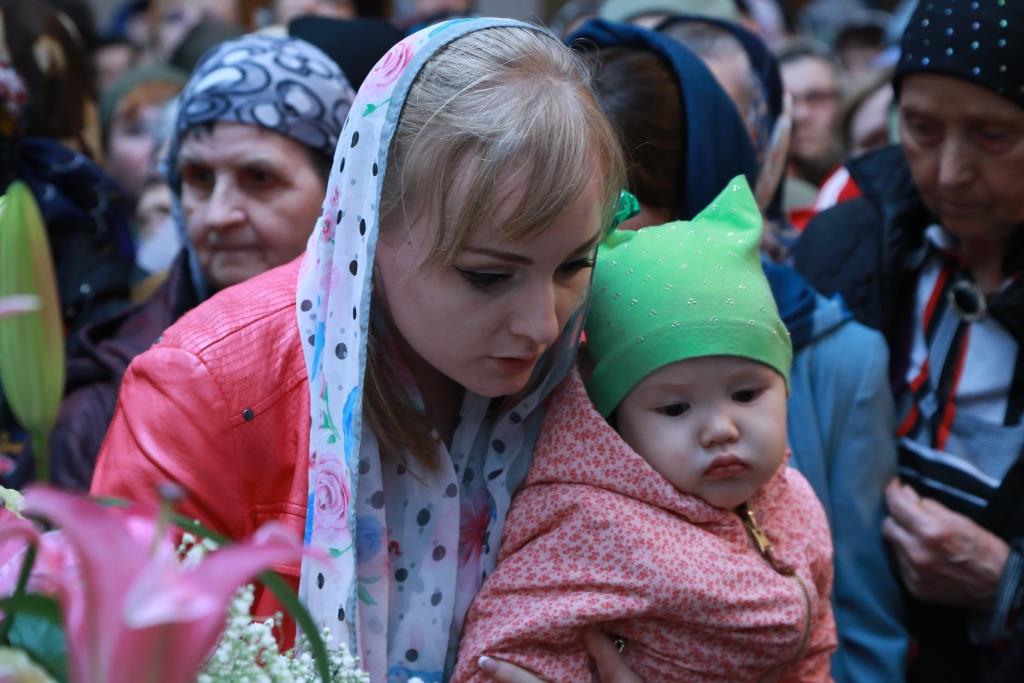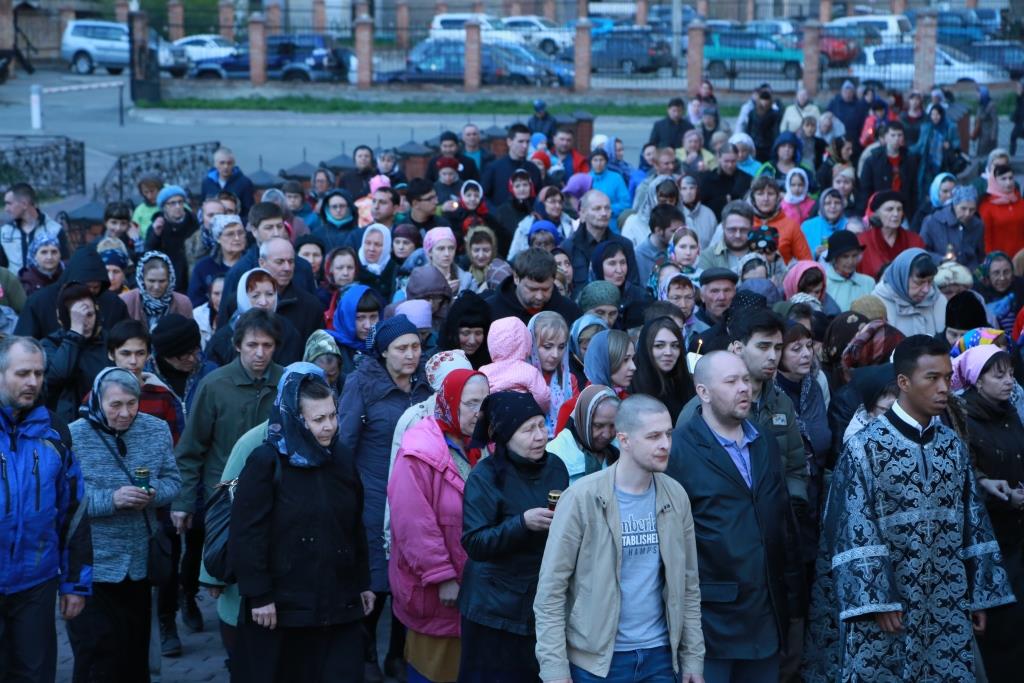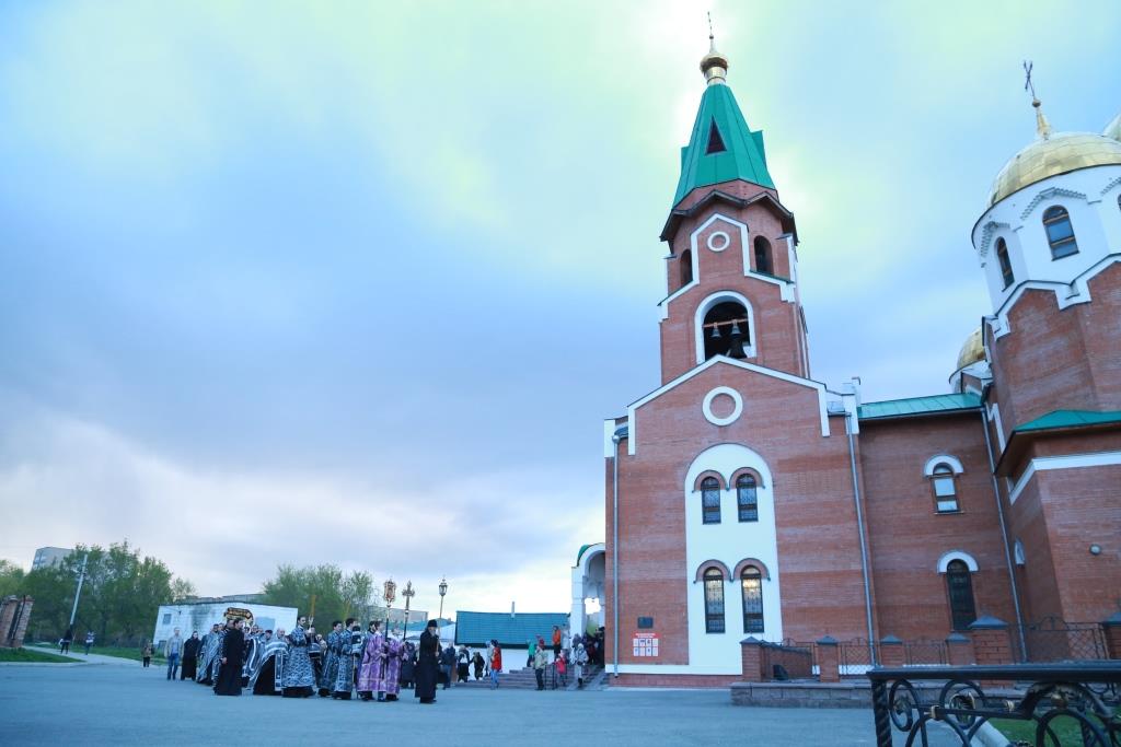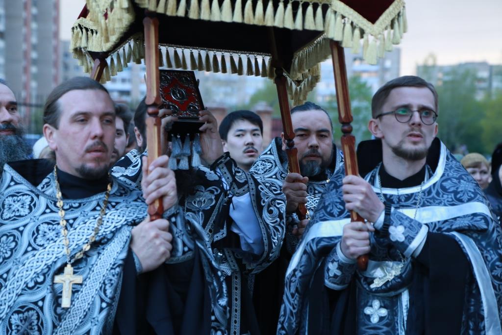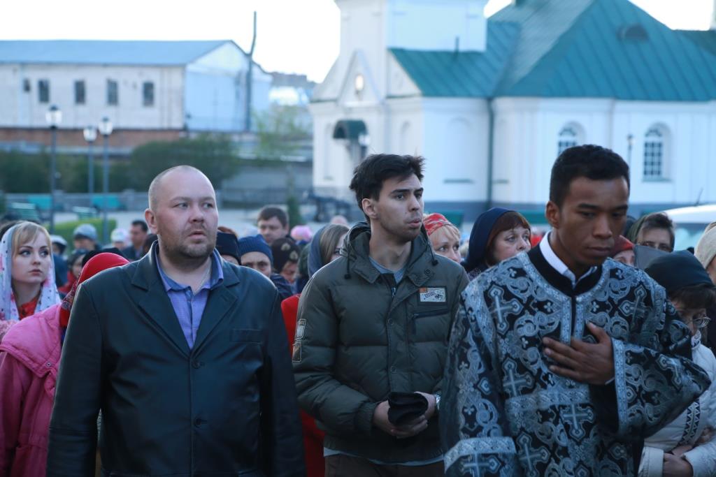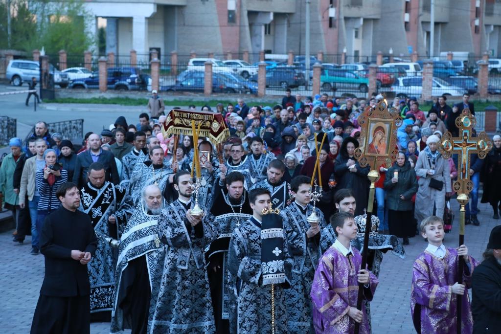 По окончании великого славословия с пением погребального песнопения «Святый Боже» Плащаница была обнесена вокруг храма крестным ходом.